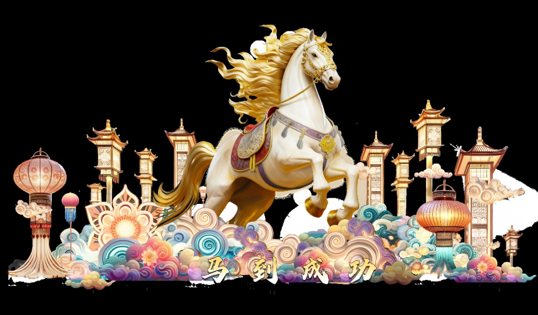非遗新春灯区:13米宽广绣元素门头,搭配醒狮、财神等吉祥元素,年味十足;