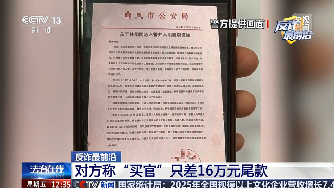 浙江嘉兴市公安局南湖区分局大桥派出所民警 郭尧勋:干部的提拔晋升是有明确的规定和程序的,不可能说在网上通过随便一张图片就代表你晋升了,这个一看就是假的,但是往往我们的被害人可能也意识不到这么多,这里要提醒大家的就是遇到这种情况,第一时间要向公安机关求助。