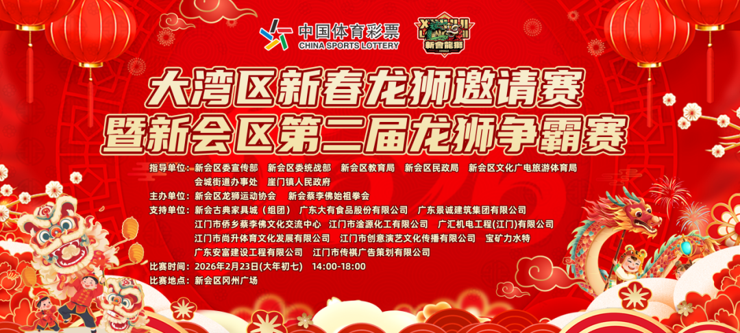 新年的钟声逐渐敲响,喜庆的氛围一点点弥漫在大街小巷。在这个充满欢乐与希望的新春佳节,一场别开生面的文化盛宴即将在新会区拉开帷幕!大湾区新春龙狮邀请赛暨新会区第二届龙狮争霸赛将于2月23日(大年初七)14:00-18:00在新会冈州广场震撼上演!我们诚邀各位市民朋友前来共赏这场精彩绝伦的视觉盛宴!