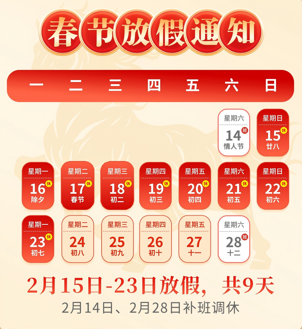 根据《国务院办公厅关于2026年部分节假日安排的通知》(国办发明电〔2025〕7号)的文件精神,春节假期为2月15日(农历腊月二十八、周日)至23日(农历正月初七、周一)放假调休,共9天。