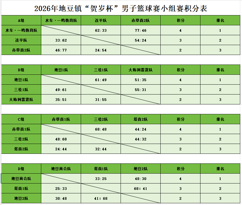 地豆“贺岁杯”精彩不断!在大板崀村篮球场进行为期三日的小组淘汰赛已圆满结束。12支参赛队伍的运动健儿们在球场上挥洒汗水、奋勇争先,以昂扬姿态诠释体育拼搏精神,下面,就让我们一同回顾小组淘汰赛的精彩赛况,了解最新积分情况与小组排名!