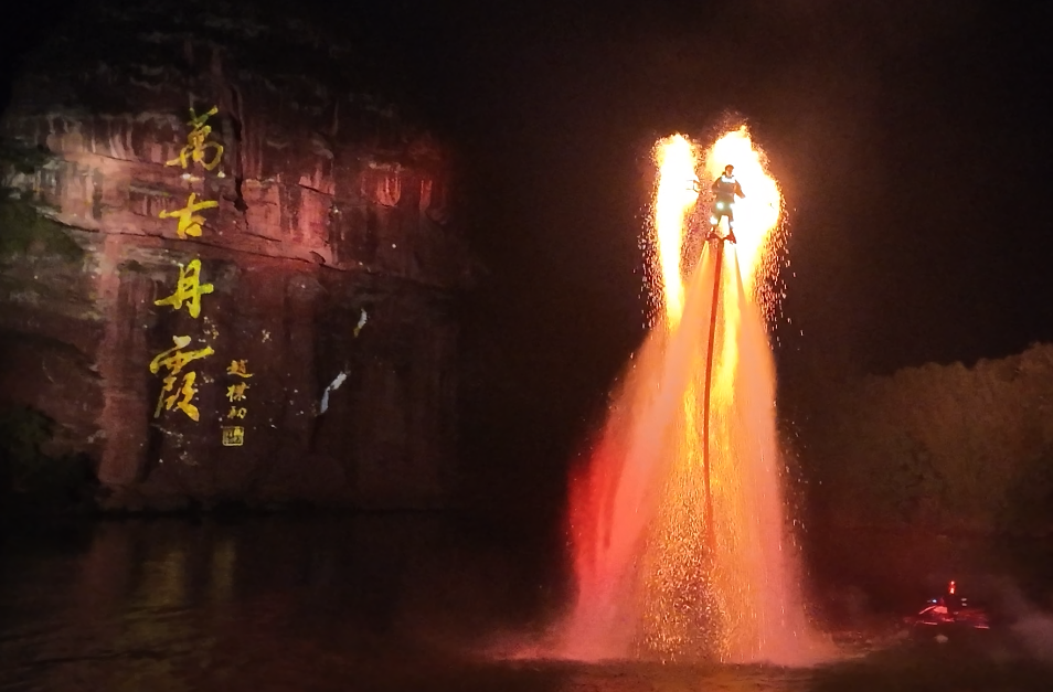 ✨活动内容:水上飞人驭火行空,凌波踏浪而来,以圣火降世之姿启封江湖序章。江上火壶映着赤色披风,火焰纹面具下,一场关于 “圣火护坛、侠影归山” 的武侠叙事在夜幕下就此开篇。