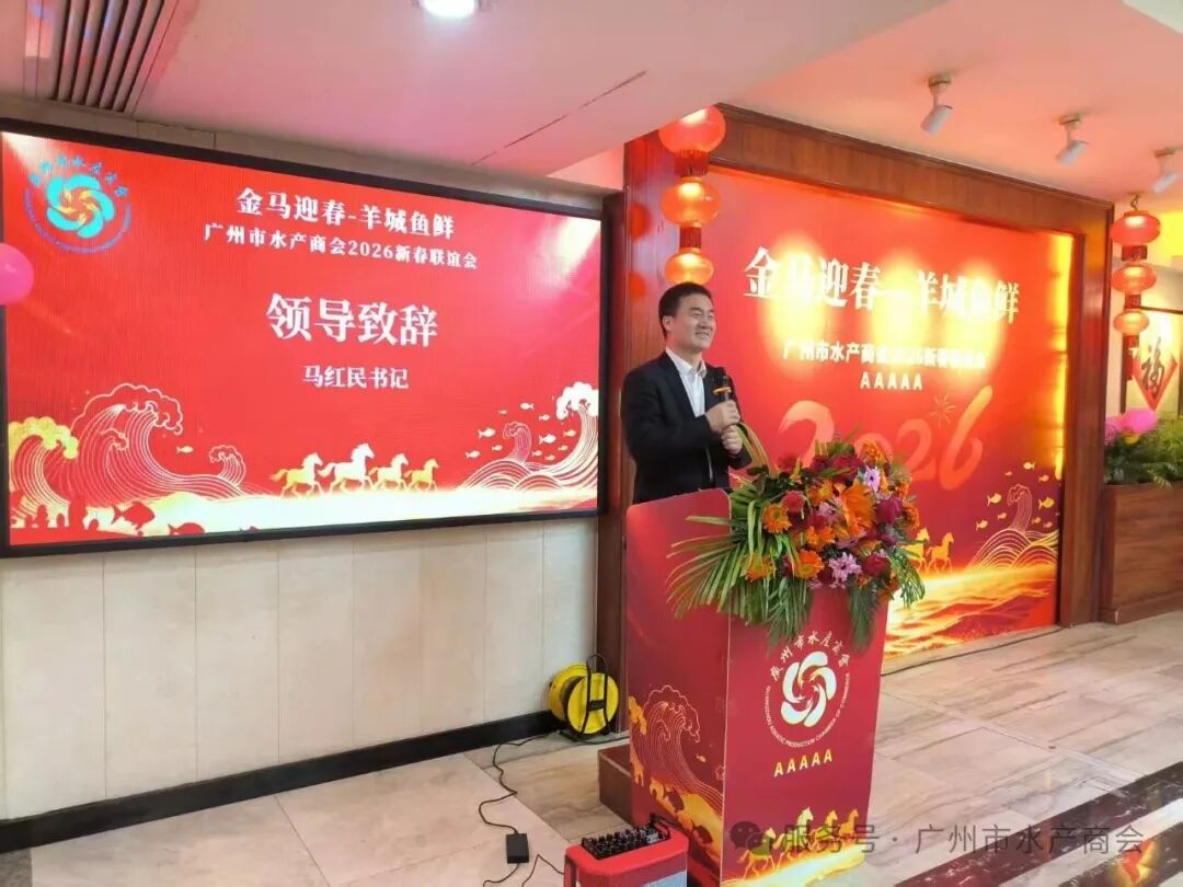 越秀区委统战部副部长、区工商联党组书记马红民在致辞中表达对商会工作的支持与鼓励,提出强化党建引领、深化行业合作交流、勇担社会责任等建议,祝愿2026年水产行业发展向好。