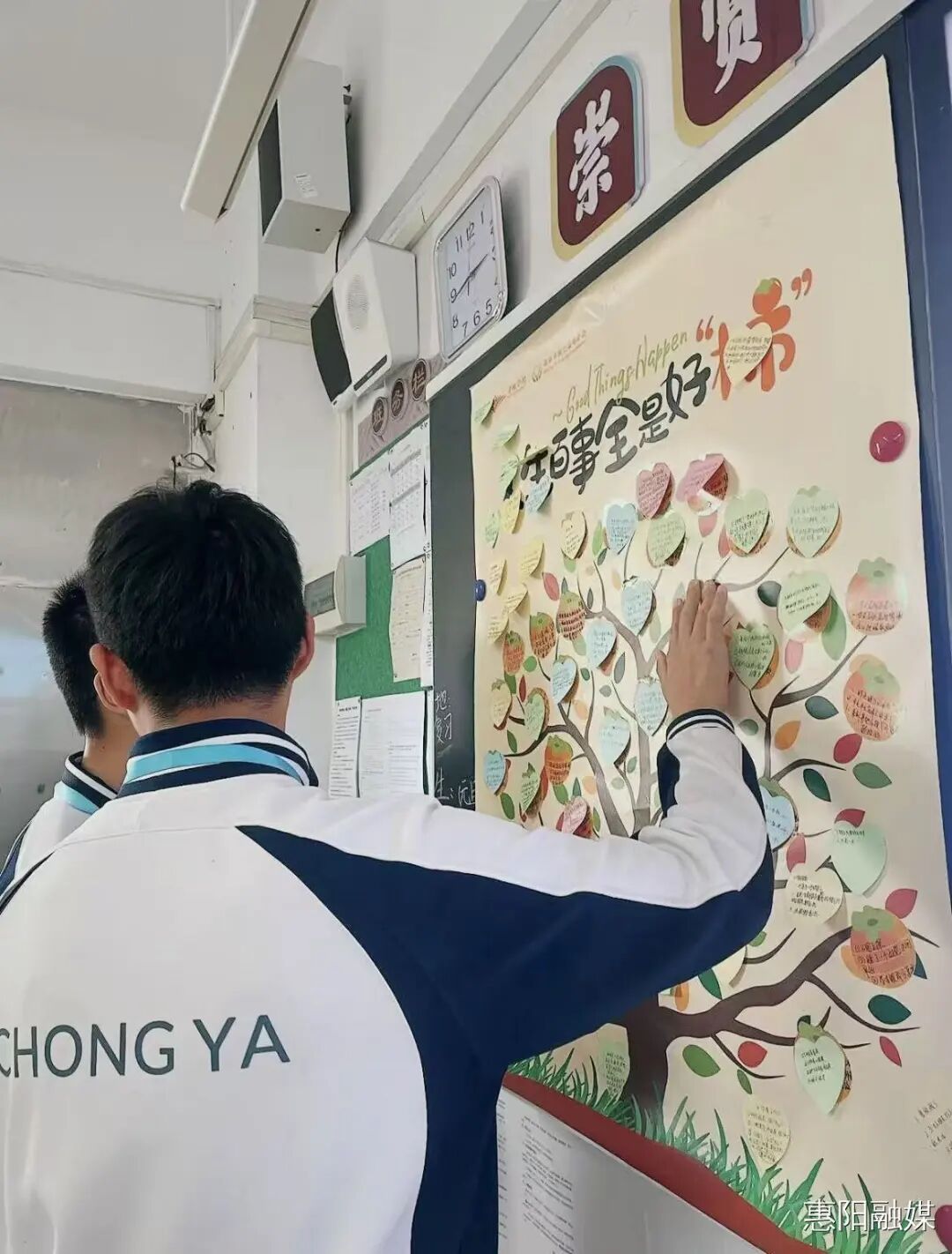 “在同桌的帮助下,我解决了一道难题,很开心。”“下课和同学玩大乱斗,非常有趣。”“英语考了全班第一,开心!”上个学期,惠阳区崇雅中学的“幸福树”上贴满了学生们记录日常小确幸的卡片,从解决一道难题到获得一句鼓励,这棵由细微快乐不断浇灌生长的“树”,成为学生们积极情绪的见证。