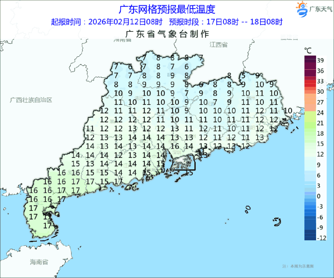 17-19日早晨,西部市县阴天间多云有分散小雨,其余市县多云局部有小雨;粤北市县气温下降6~8℃,其余市县下降3~5℃;最低气温:粤北市县7~10℃(高海拔山区3~6℃),粤西和珠三角南部沿海市县14~17℃,其余市县11~14℃。另外,17日早晨,粤西市县和海面局部有轻雾。