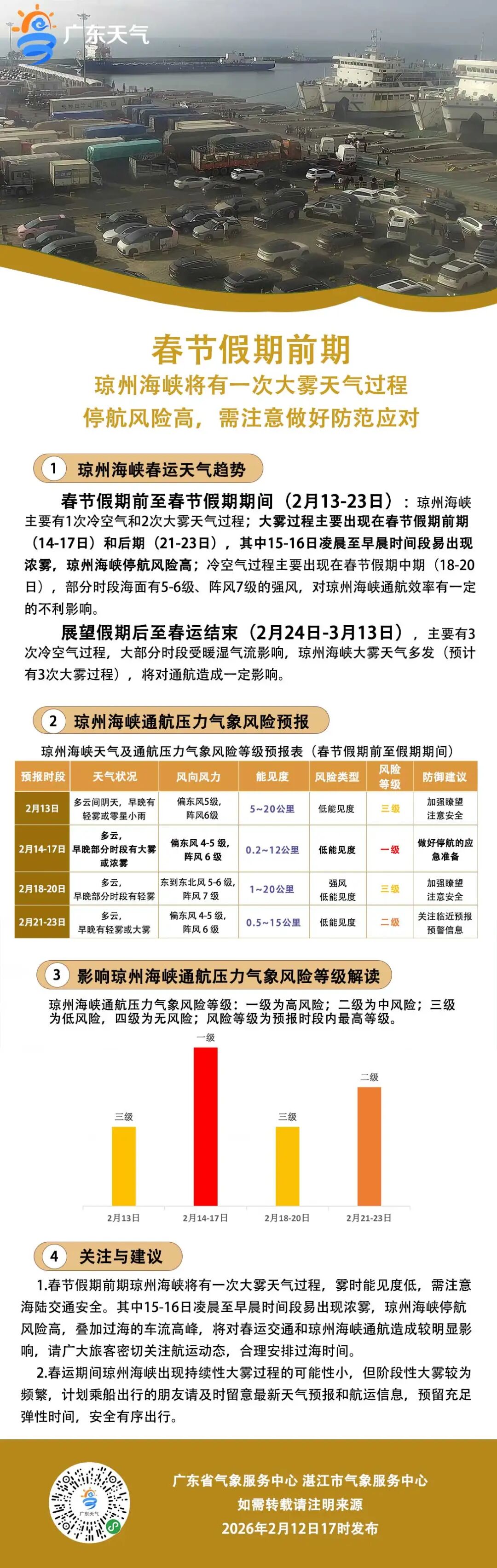 琼州海峡预报:春节假期前至春节假期期间(2月13-23日):琼州海峡主要有1次冷空气和2次大雾天气过程;大雾过程主要出现在春节假期前期(14-17日)和后期(21-23日),其中15-16日凌晨至早晨时间段易出现浓雾,琼州海峡停航风险高;冷空气过程主要出现在春节假期中期(18-20日),部分时段海面有5到6级、阵风7级的强风,对琼州海峡通航效率有一定的不利影响。