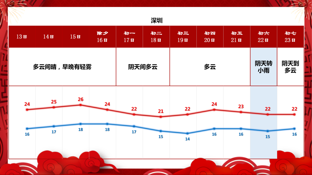 深圳气温也是先升后降,春节前最高气温26℃左右,除夕到初七最高气温介于21到24℃之间,最低气温14℃左右。