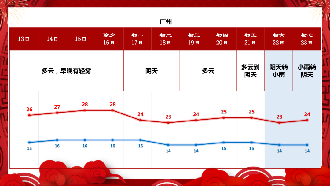 以广州为例,春节前广州最高气温将上升至28℃左右,白天甚至可以穿短袖,初一开始转凉,初一至初七最高气温介于23到25℃之间,最低气温14℃左右。