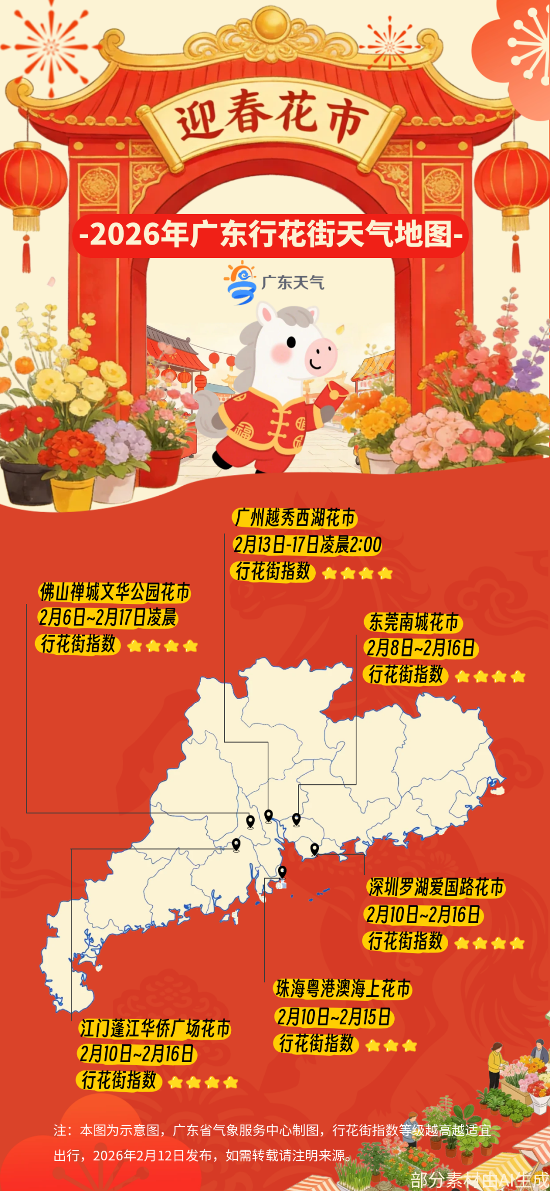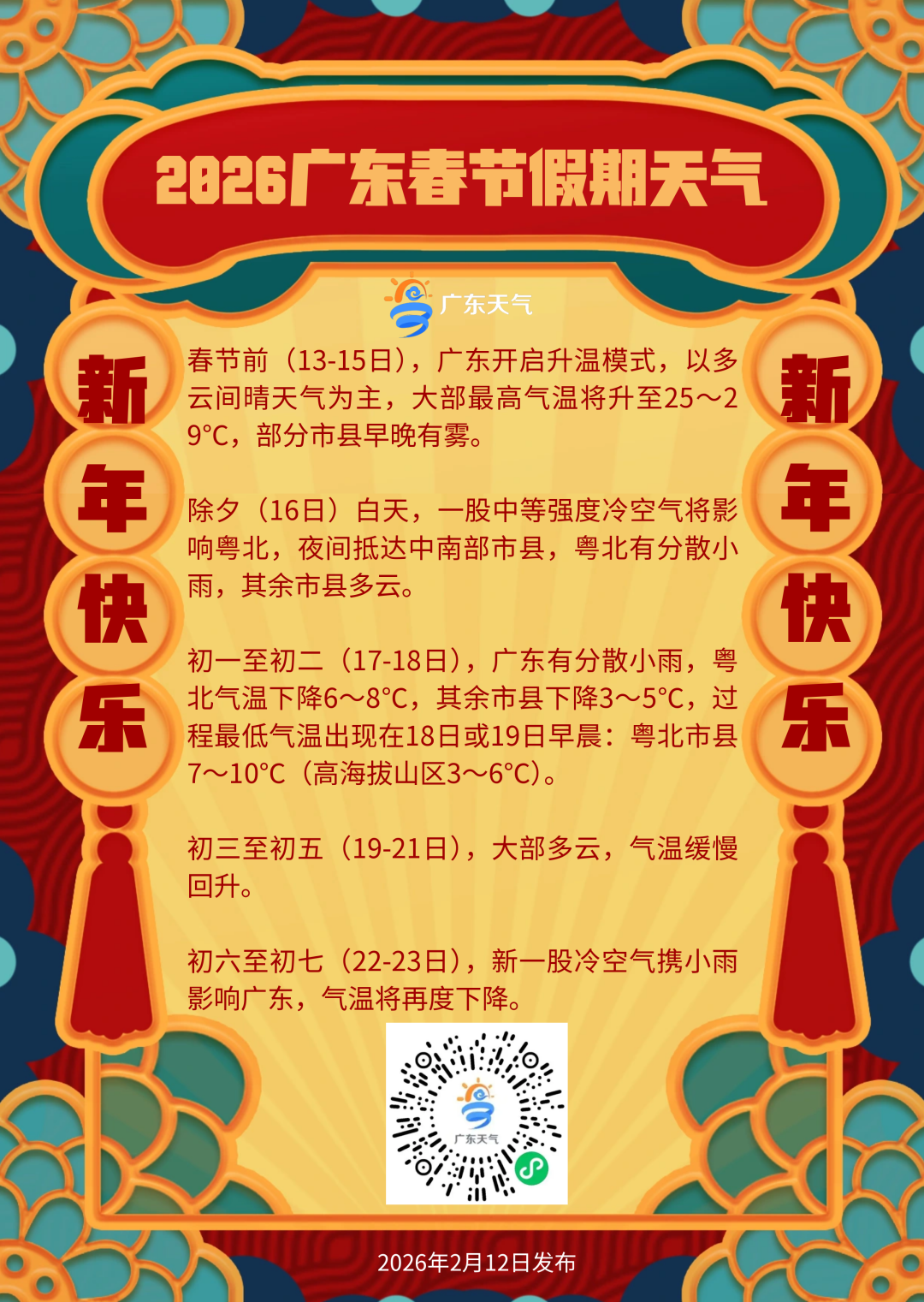 预计春节假期期间,广东无大范围强降水及强对流等高影响天气,有2次冷空气过程。春节前广东升温有雾,除夕中等强度冷空气入粤,初一初二降温有分散小雨,初三至初五缓慢回温,初六初七再迎降温降雨。