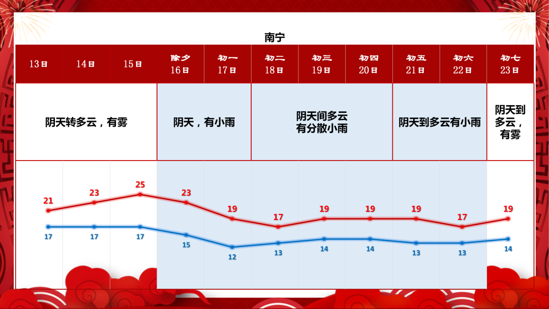 周边省市天气:春节假期期间,广西多阴雨天气,气温起伏较大。15日前气温回升,早晚有雾。受弱冷空气补充影响,16-17日有一次降温和弱降雨过程,各地日平均气温下降4~6℃、局地8℃以上,20-21日气温逐渐回升;22-23日受新一股冷空气影响,气温再次下降。海南以多云天气为主,总体温暖舒适。