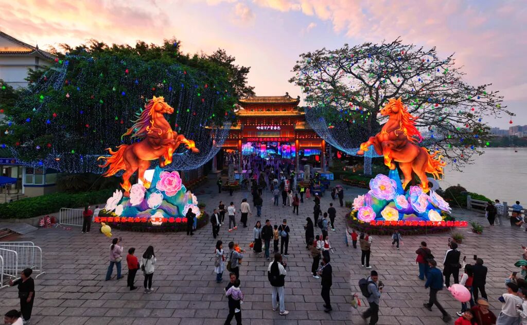 与这幅宏大画卷相呼应的,是入口处气势恢宏的《马到成功》。两匹神骏昂首扬蹄,通体流光溢彩,肌肉线条在灯光下充满力量感,粉色与紫色的巨大花朵灯饰在其身旁缓缓开合,动态十足,寓意新年奔腾飞跃、事业有成。众多游客以此为背景拍照打卡,祈愿龙马精神,开启一年好兆头。
