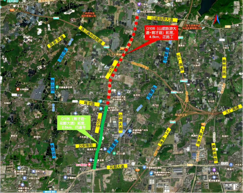 据了解,G106加建沥青路面和排水箱涵工程(花都大道—山前大道)为花都区南北向重要干线道路提升改造项目,是完善区域路网结构、缓解交通压力、提升通行能力的重要工程。该工程北起山前大道,南至花都大道,全长约7.3公里,本次通车段为G106国道花山镇中心区育才路至花都大道段,全长约2.5公里。