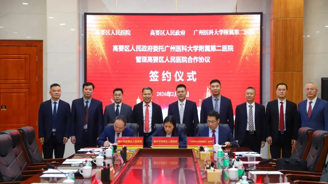 2月13日,高要区人民政府委托广州医科大学附属第二医院管理高要区人民医院举行签约仪式,标志着双方院地医疗协同合作迈入实质性推进阶段,这是高要区深入实施“百千万工程”、补齐医疗服务短板的重要举措,也是回应群众“家门口享优质医疗”期盼的民生实事。广州医科大学党委常委、副校长付晓东,肇庆医学院党委副书记、校长周麟,高要区委书记陈德培,高要区委副书记、区长韦贤康出席仪式并见证签约。