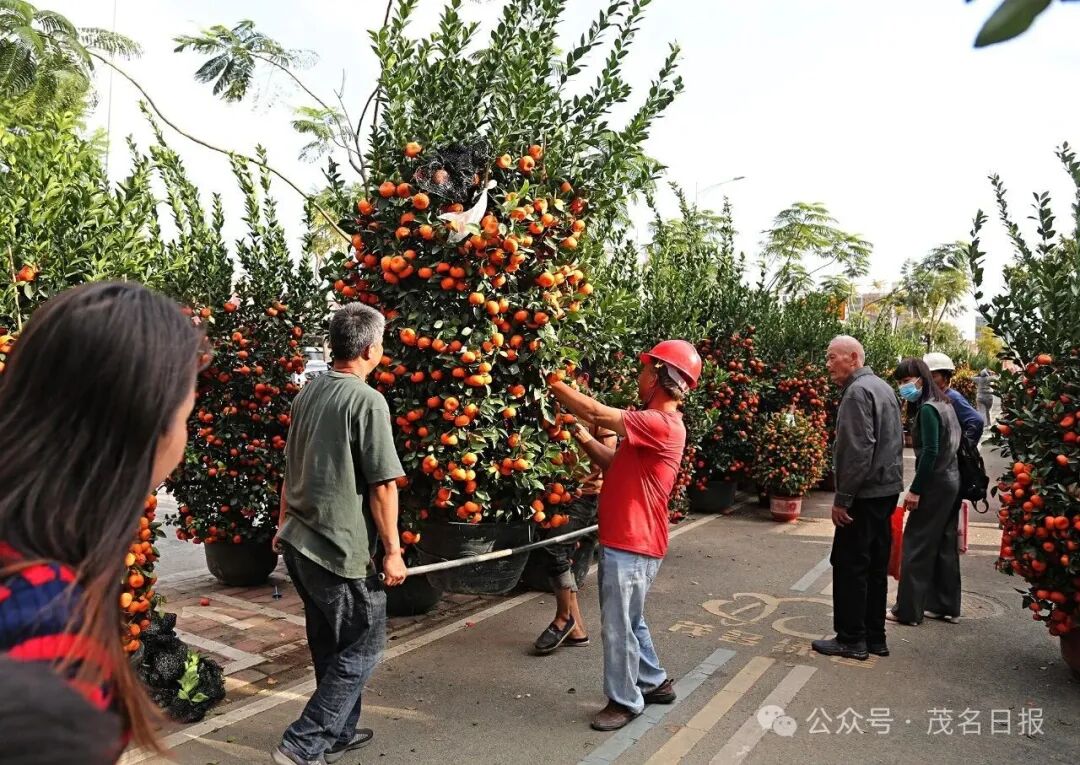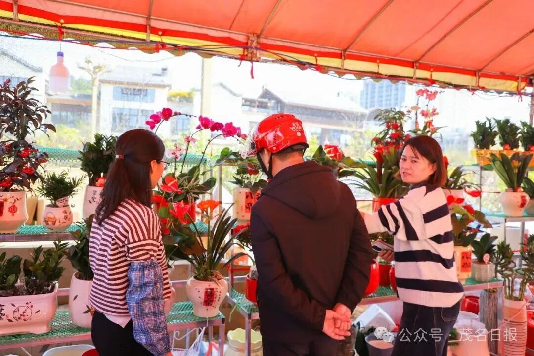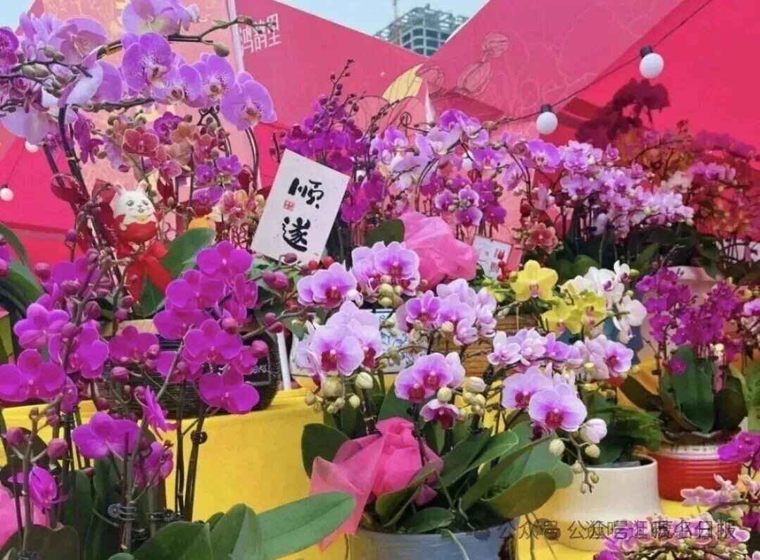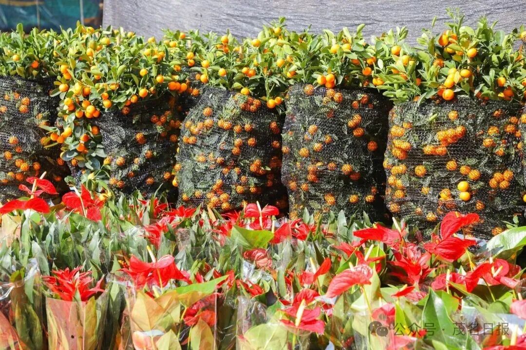 相较于对联街区的满目红韵,市民广场的迎春花市更添生机与芬芳。各个摊位上,大小年桔缀满金黄果实,寓意“大吉大利、年年有余”;各色年花争妍斗艳,姹紫嫣红,将花市装点得格外靓丽,引来不少市民前来采购。