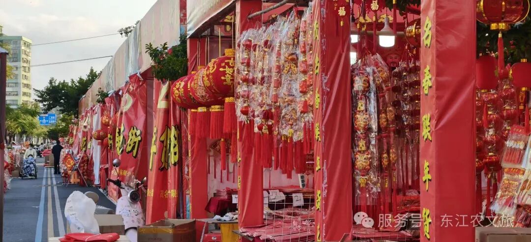 位于人民北路的茂名迎春花街。整条街上数十家店铺已全部开门营业,红灯笼、春联、烫金福字、中国结、各式红包等春节挂件琳琅满目,一片红火景象。多家店铺将商品悬挂在店外,吸引过往市民驻足选购。