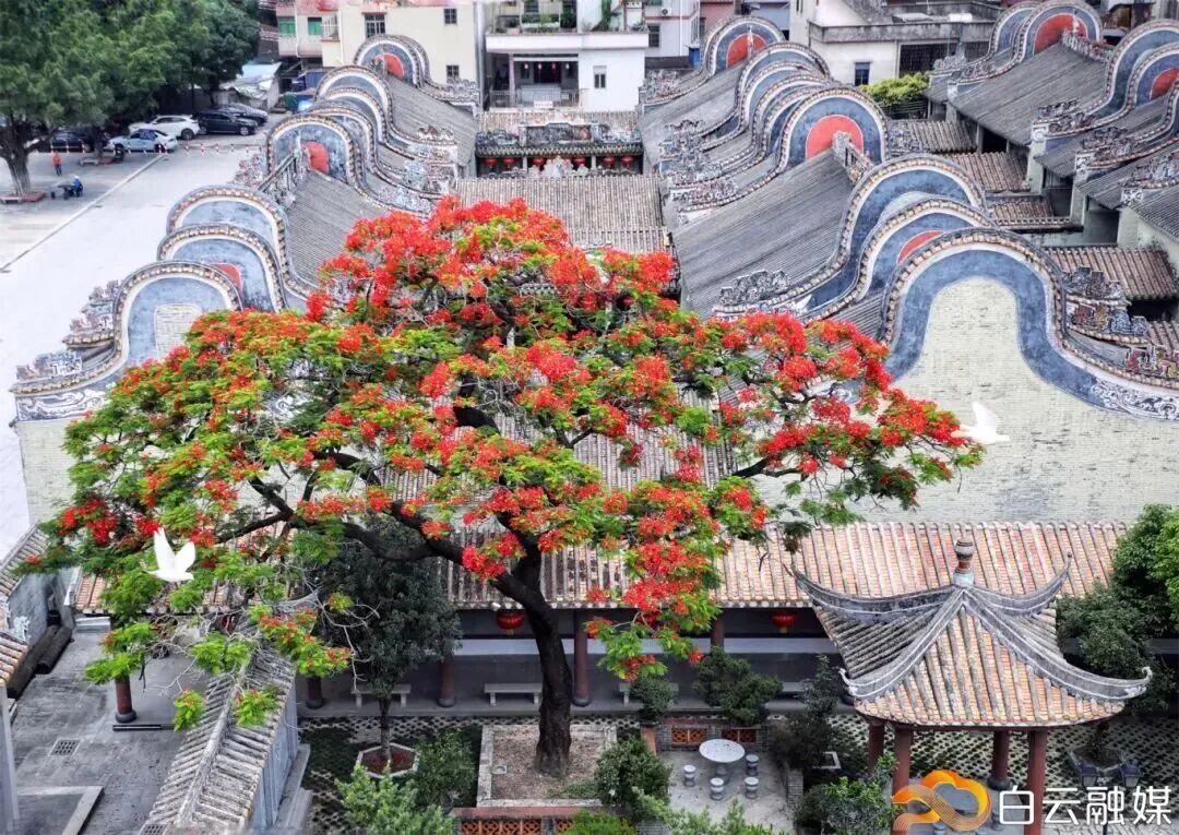 每年五月的时候,凤凰花和百年古祠梦幻联动,花朵灿若云霞、红彤似火,与古祠堂的镬耳、灰塑交相辉映,真是靓到没对手!