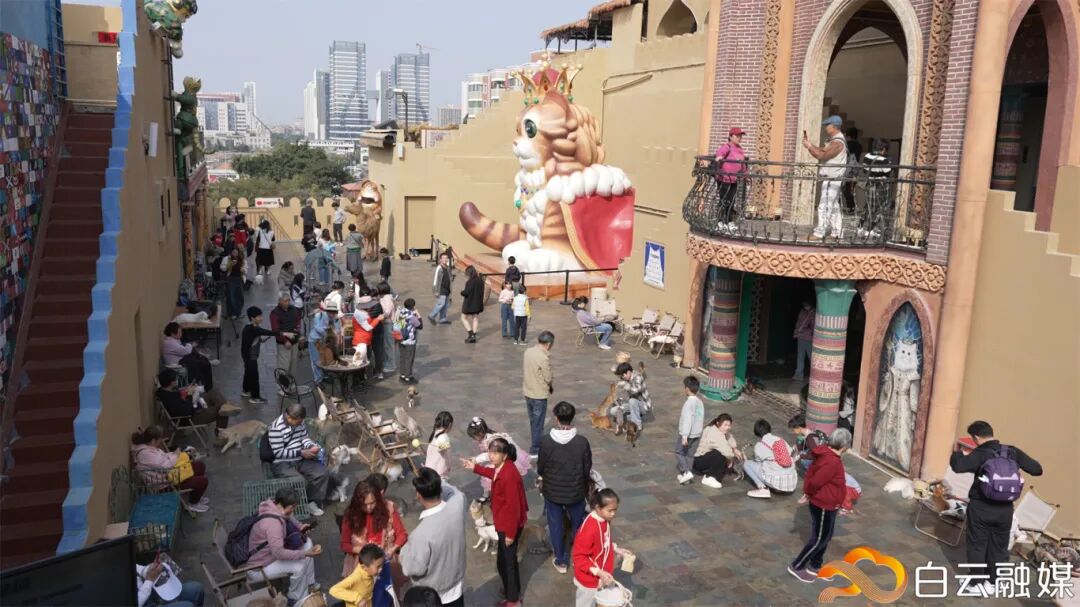 月亮猫城以一个用黄土墙为布景的主建筑将三层立体空间连接起来,搭配巨型猫咪雕塑、壁画长廊、沙漠绿洲等元素,从远景到细节均是复刻丝绸之路,让人一秒穿越到大西北。