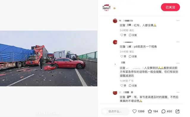 “幸亏(当时)高德及时的提醒,不然后果真的不堪设想。”上述博主称,听到导航前方紧急停车信息后有意识减速。“语音和文字都有(提醒)。”该博主表示。