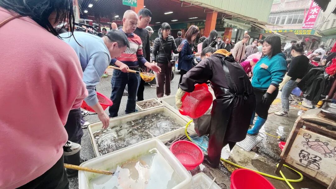 水产区同样热闹非凡,摊主邱先生忙得脚不沾地,他一边捞鱼一边向记者介绍,春节假期期间,生意一天比一天好,尤其是今天上午,几乎没停过手。