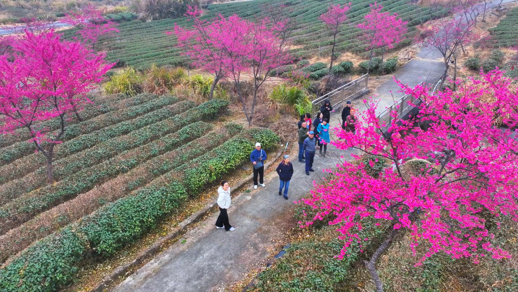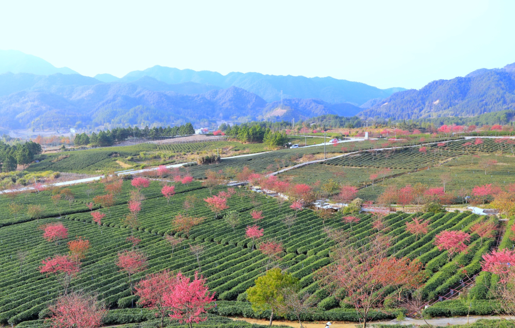 清晨推开窗,樱花与茶园交织的景色映入眼帘。品一杯刚采摘的新丰高山茶,在茶香与花香中放松身心,枕着星空入眠,在新丰的暖冬里,做一个关于春天的梦。