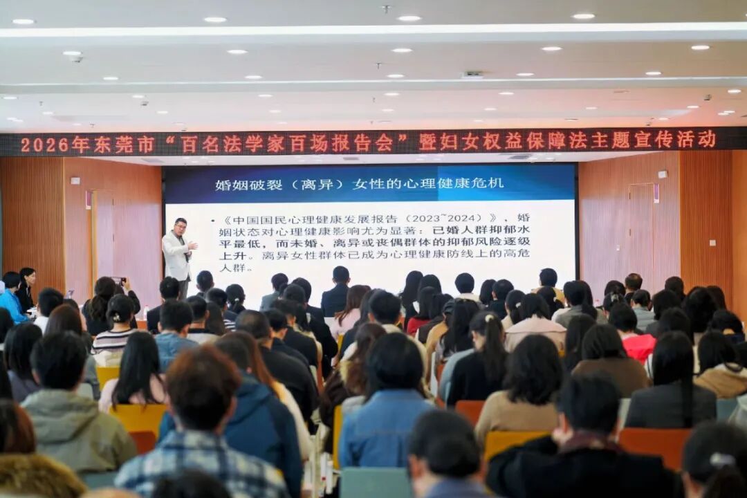 近日,市法学会联合市妇联、市中级人民法院、市人民检察院、市公安局、市司法局共同举办2026年东莞市“百名法学家百场报告会”暨妇女权益保障法主题宣传活动,发布了2025年度东莞市依法维护妇女儿童权益优秀案例,开展妇女权益保障法主题讲座。市直相关单位领导、优秀案例单位代表及各镇街(园区)妇联、市法学会负责同志等参加活动。