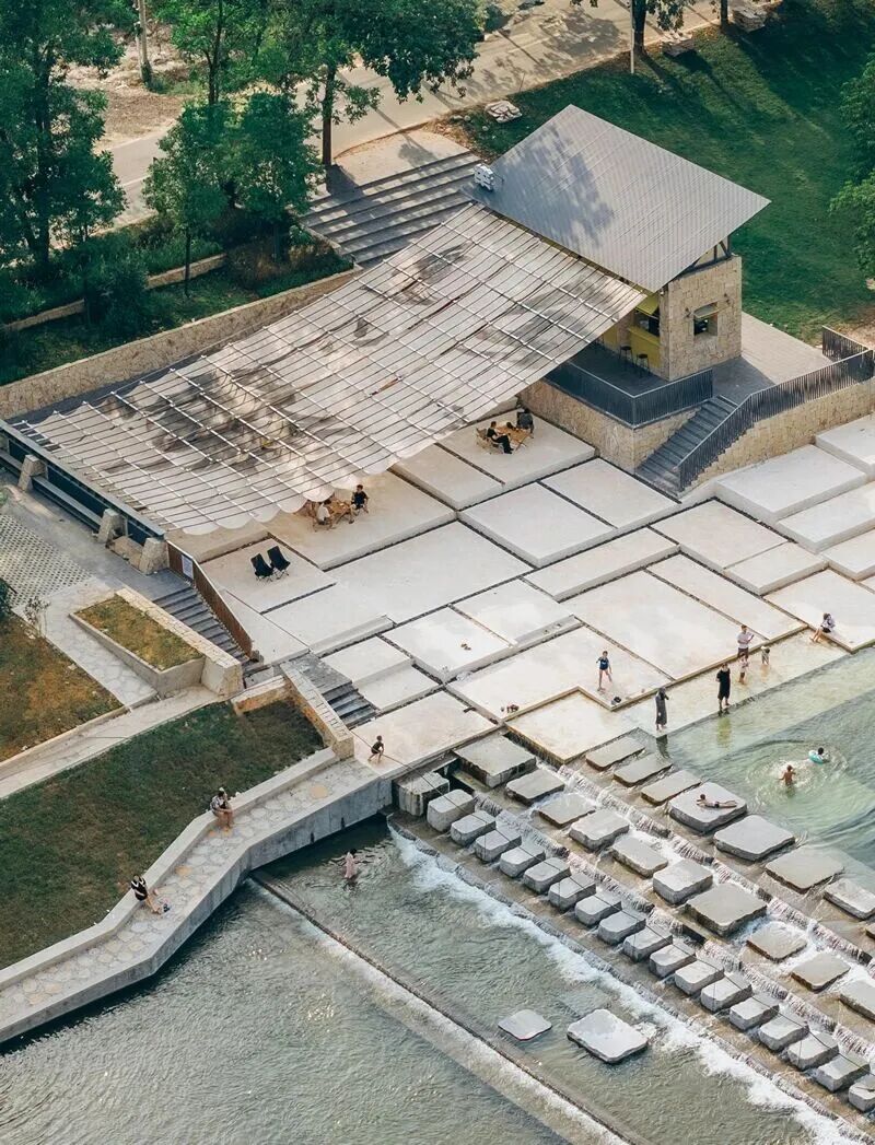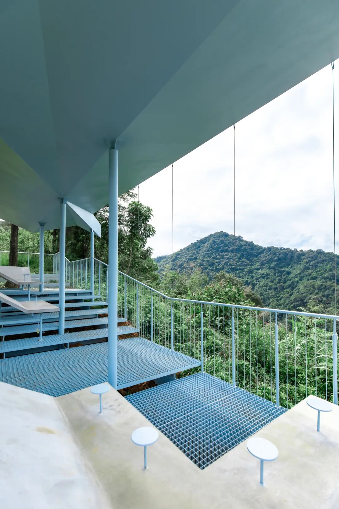 “山行驿”取意于苏轼“东风知我欲山行,吹断檐间积雨声”的诗意场景,选址于东侧山脚,是旅程的起点,也是观云的首站。这里的台地式建筑巧妙地串联起咖啡区与步道,既为游客提供了补给,又成为了绝佳的观景拍照点。
