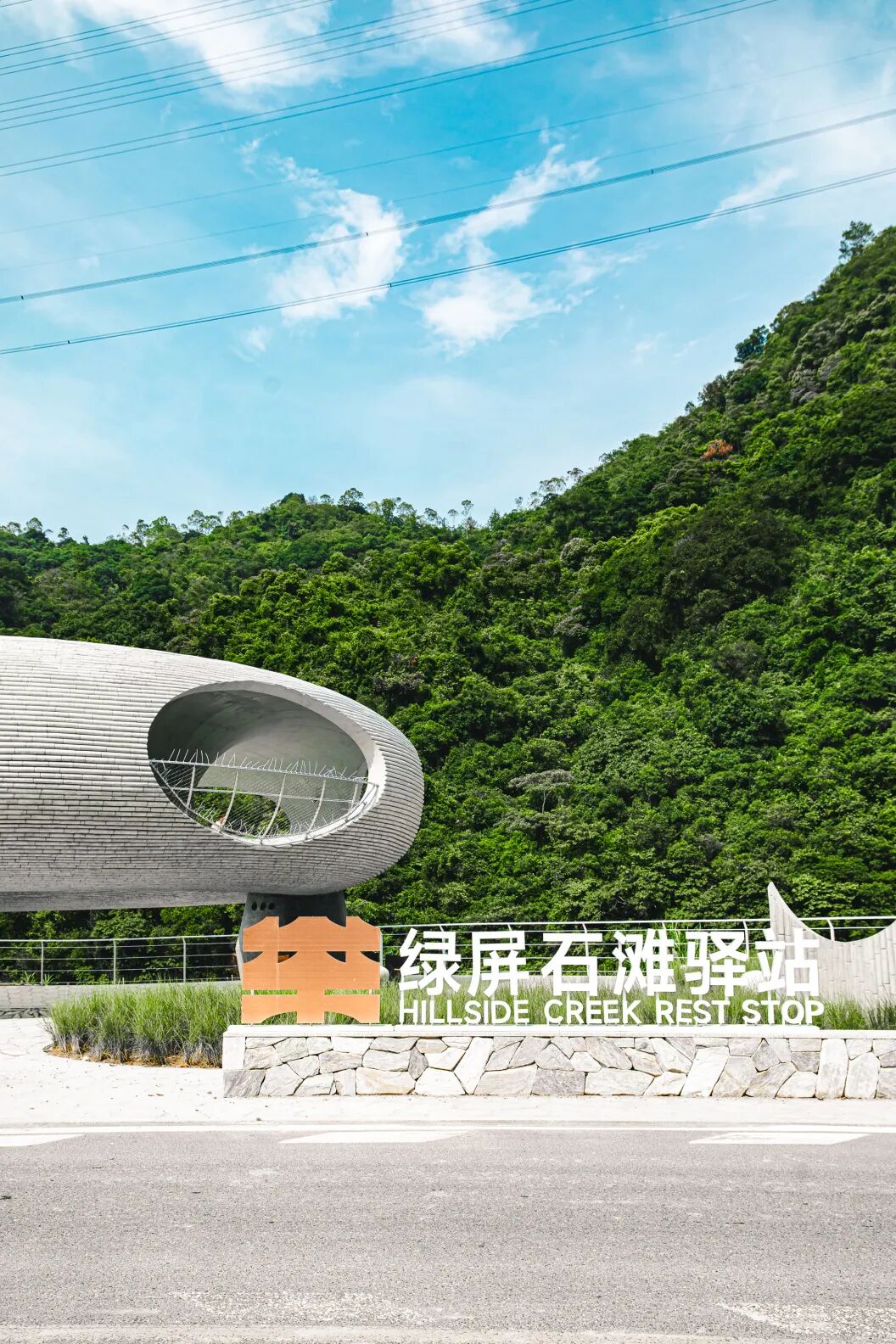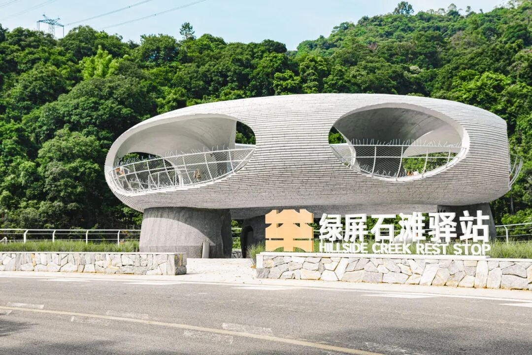 站在绿屏石滩驿站前方的道路上,整个“大甜甜圈”造型的建筑尽收眼底。独特的造型矗立在青山绿水之间,与周围的自然景观形成了鲜明的对比又和谐共生。