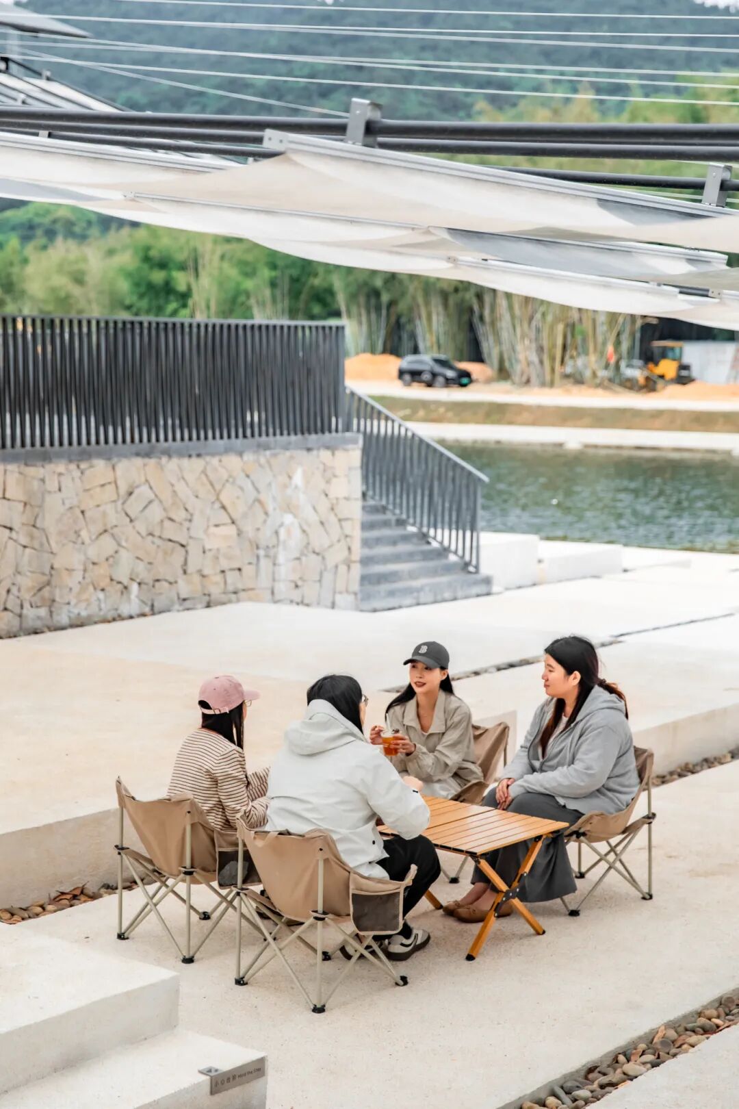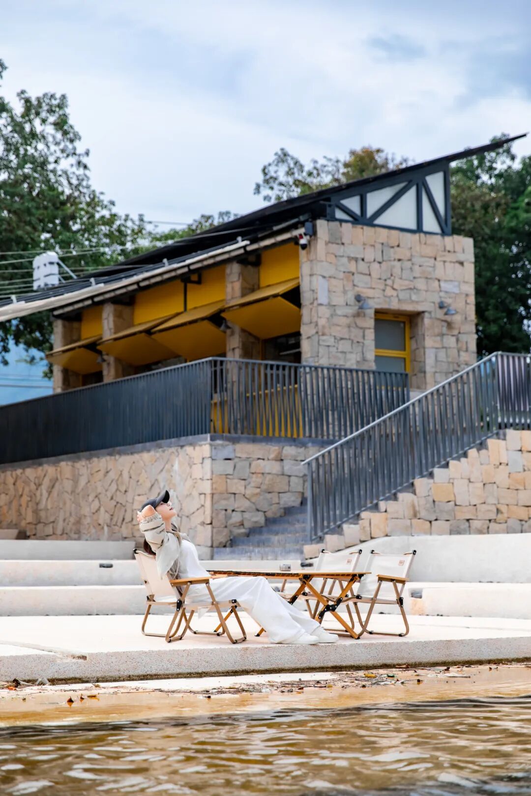 坐在溪畔边的露营椅上,面朝山野和河流,拍一组悠闲的放松照,让身心完全沉浸在这份宁静与美好之中。这样的照片,不仅记录了你的美丽瞬间,更定格了你在下浪溪畔驿站的惬意时光。