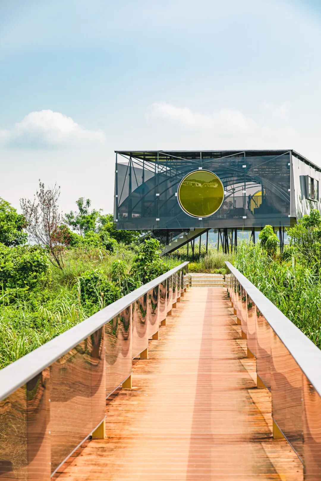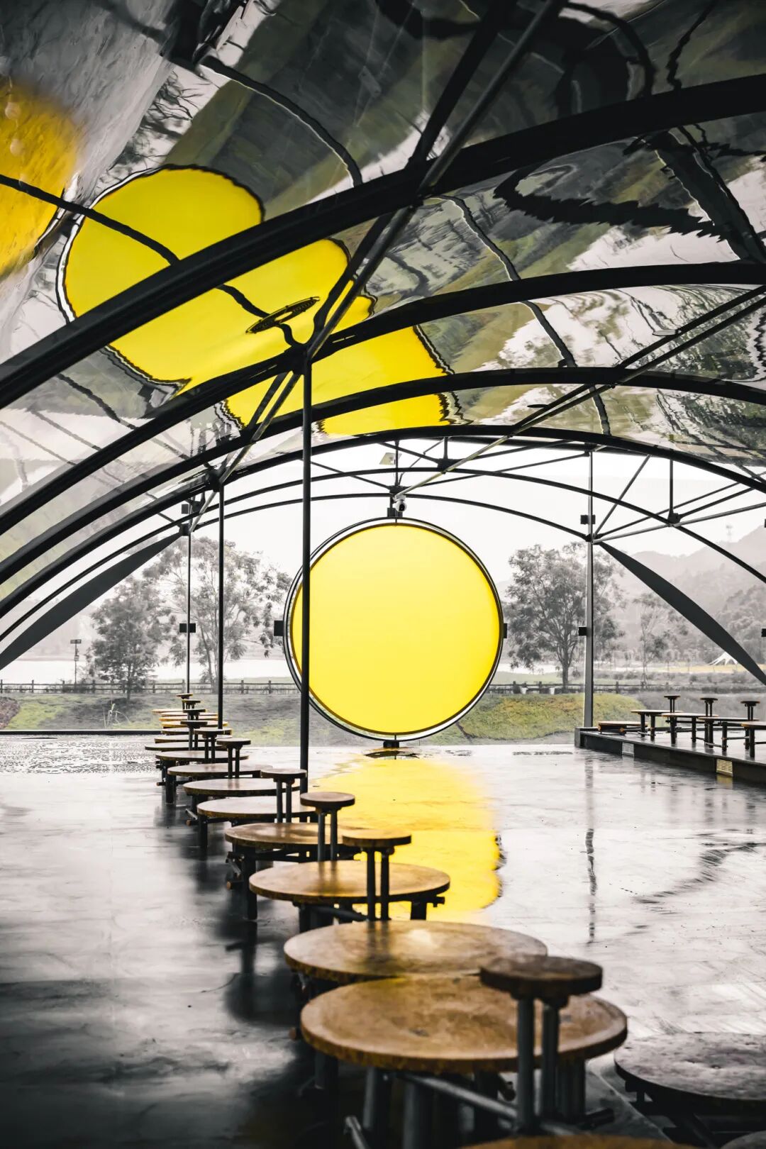 来到“卧云榭”,首先映入眼帘的便是那独特的轻钢折板顶棚,以顶棚的线条和天空为背景,展现出建筑的现代感与自然融合的奇妙效果。