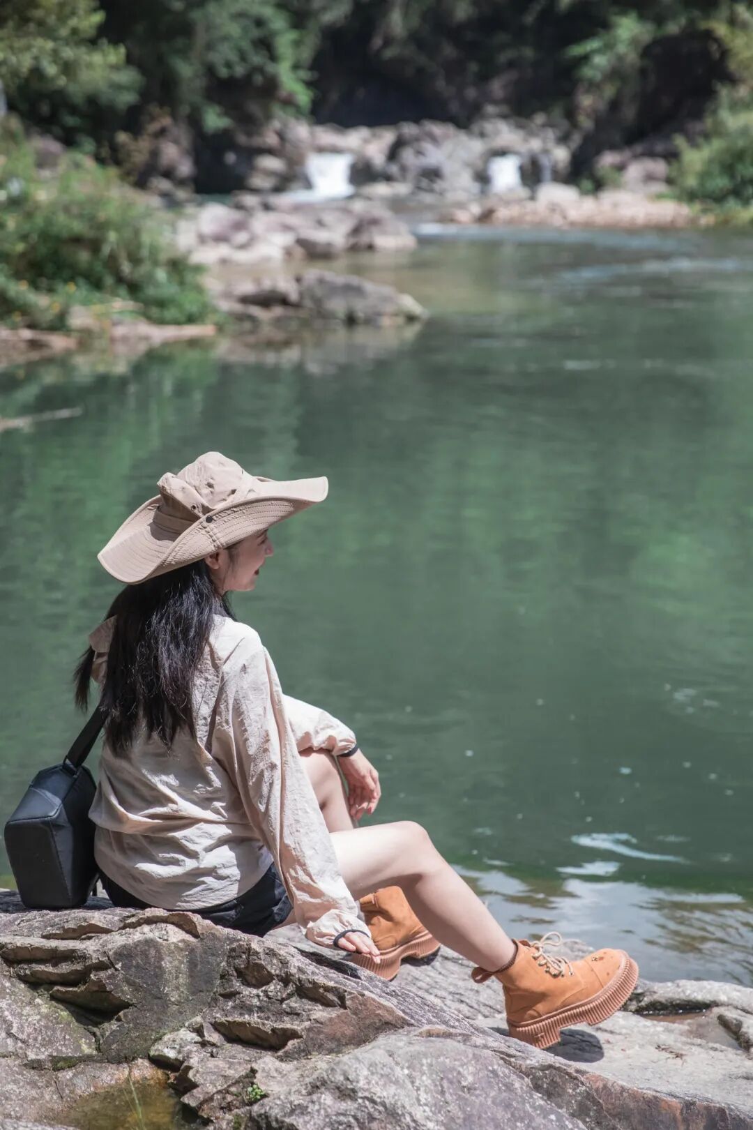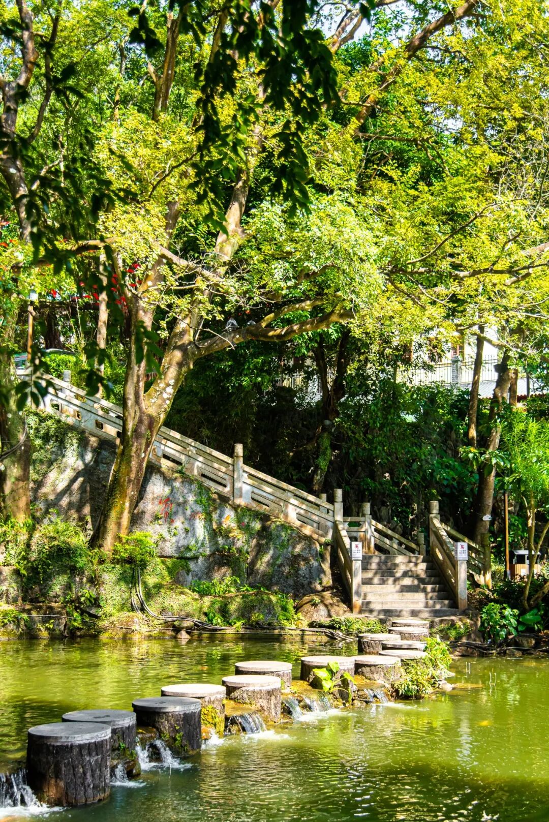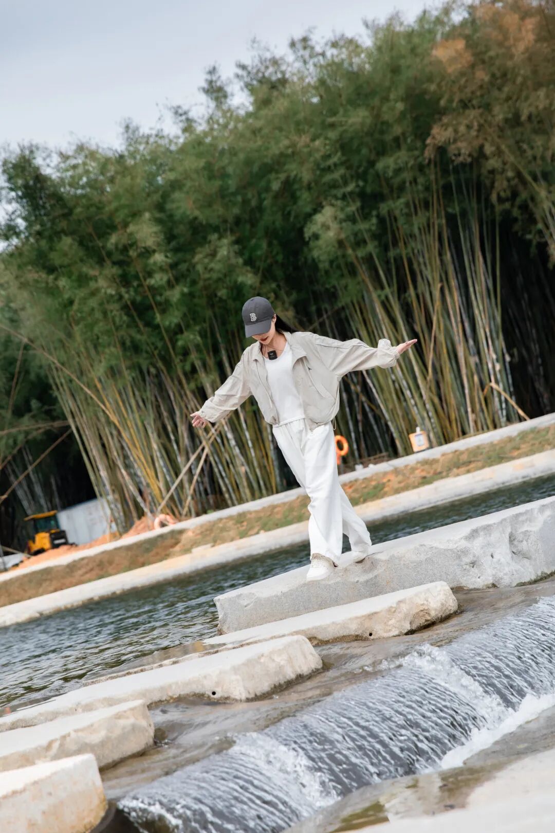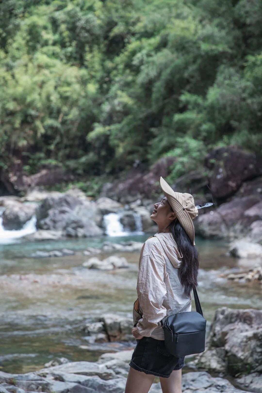 溪水潺潺,石头斑驳,踏上溪中的步石,仿佛踏入了一幅流动的山水画卷。小心翼翼地走在上面,双臂自然张开,保持平衡的瞬间被镜头捕捉,照片便有了动态的美感与趣味。