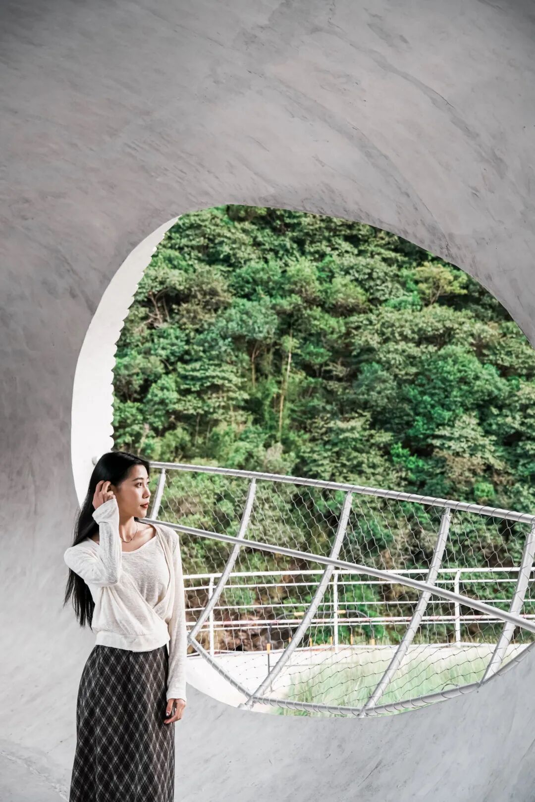站在洞口的中央,背对着镜头,望向远处连绵的青山和郁郁葱葱的绿水,仿佛置身于这幅画卷之中,成为了自然与建筑融合的一部分。