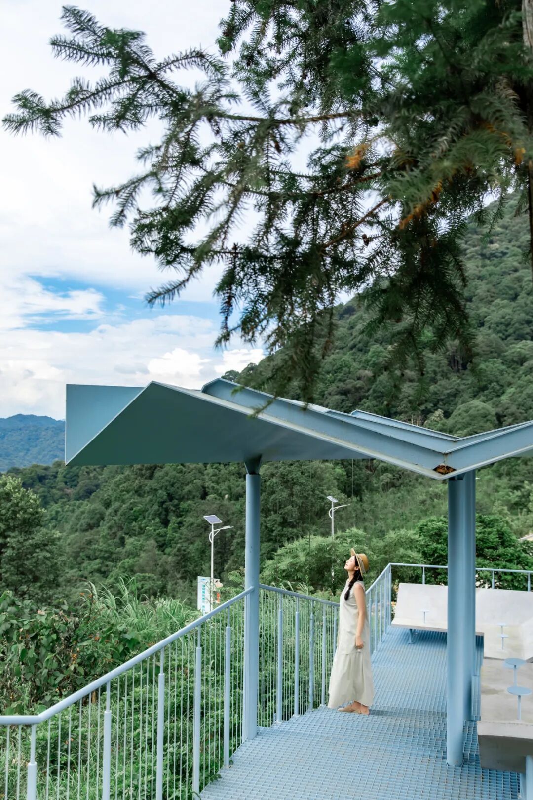 走近“吾乡亭”,站在亭子的前方,以亭子的独特造型为背景,正面拍摄。亭子的线条简洁有力,与周围的山林形成鲜明对比,此时的人物与建筑相互映衬,更能凸显出“吾乡亭”的独特气质。