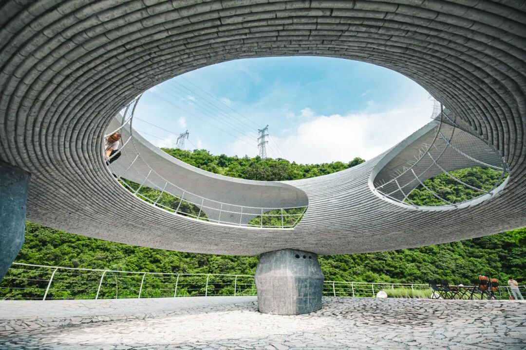 也可以走进绿屏石滩驿站内部,那些巨大的椭圆洞口就像建筑的眼睛,将周围的山林美景巧妙地框成了一幅幅生动的自然画卷。