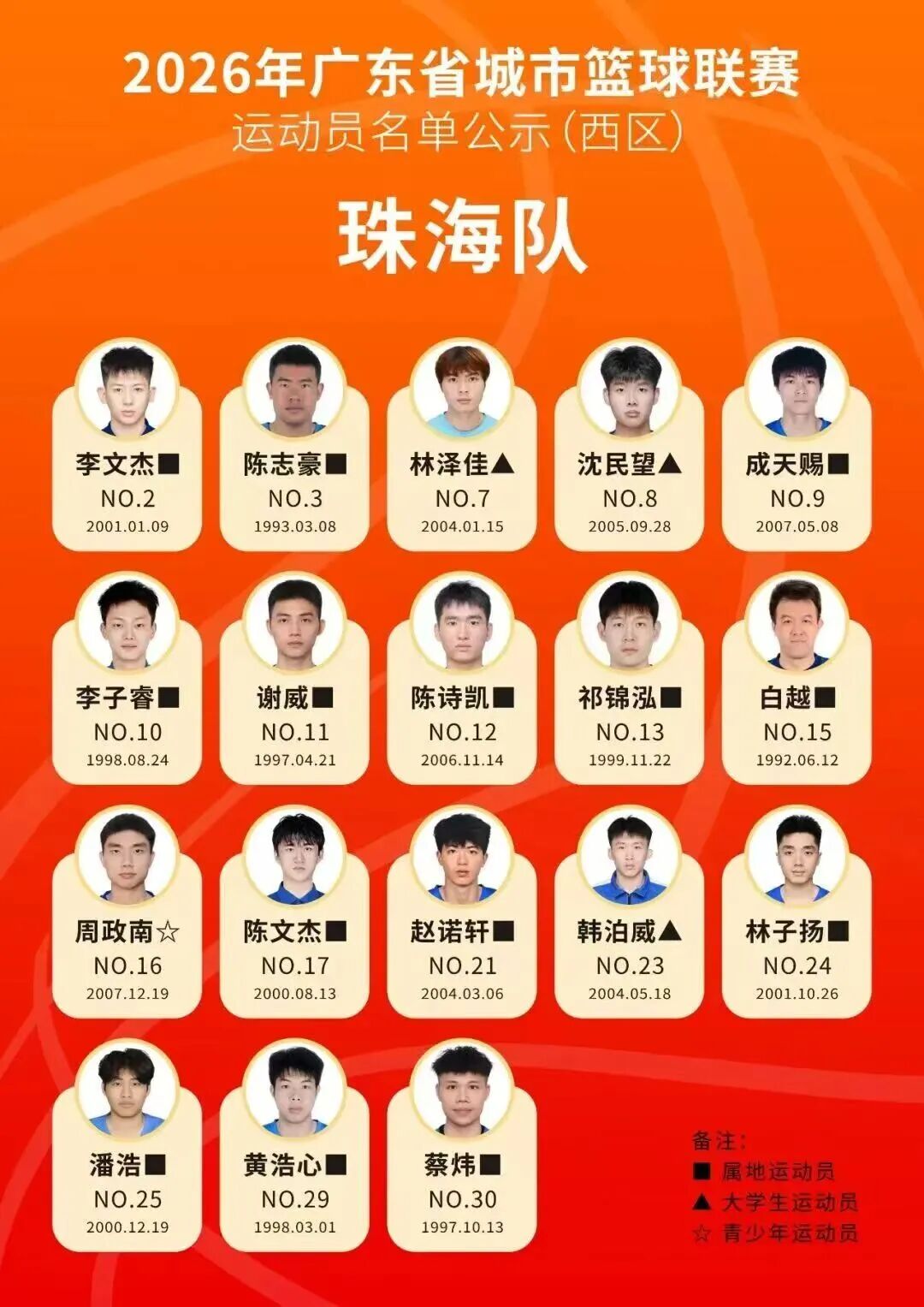 陈诗凯:高中毕业于珠海市第三中学,原珠海市青少年篮球队队员;曾带领珠海市青少年篮球队获得2024年广东省青少年篮球锦标赛亚军,带领珠海三中夺得2025年广东省中学生篮球锦标赛冠军,创造珠海青少年篮球队在省赛的最好成绩;2025年入选广东省男子篮球联赛珠海队;球风灵动,被评为广东新生代顶级双能卫之一。