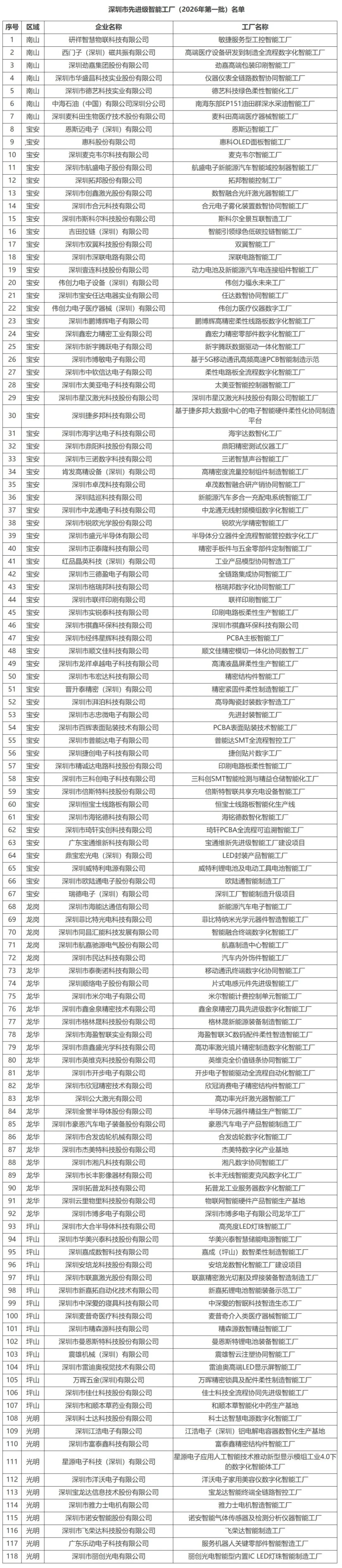 日前,深圳市工业和信息化局公布深圳市2026年第一批先进级智能工厂名单,全市共118家企业入选,其中宝安区60家企业上榜,入选数量位居全市第一。截至目前,宝安区已累计培育基础级智能工厂405家、先进级智能工厂67家、卓越级智能工厂1家(欣旺达),梯度培育体系初步成型,智能制造实力持续领跑全市。