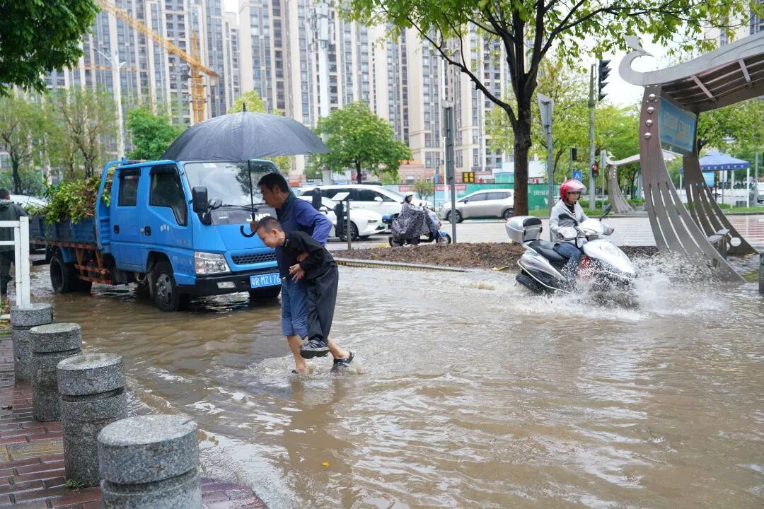 2026年3月31日下午,清城区东城街道海逸路,暴雨过后市民蹚过积水。清远日报记者 刘淑芳 摄