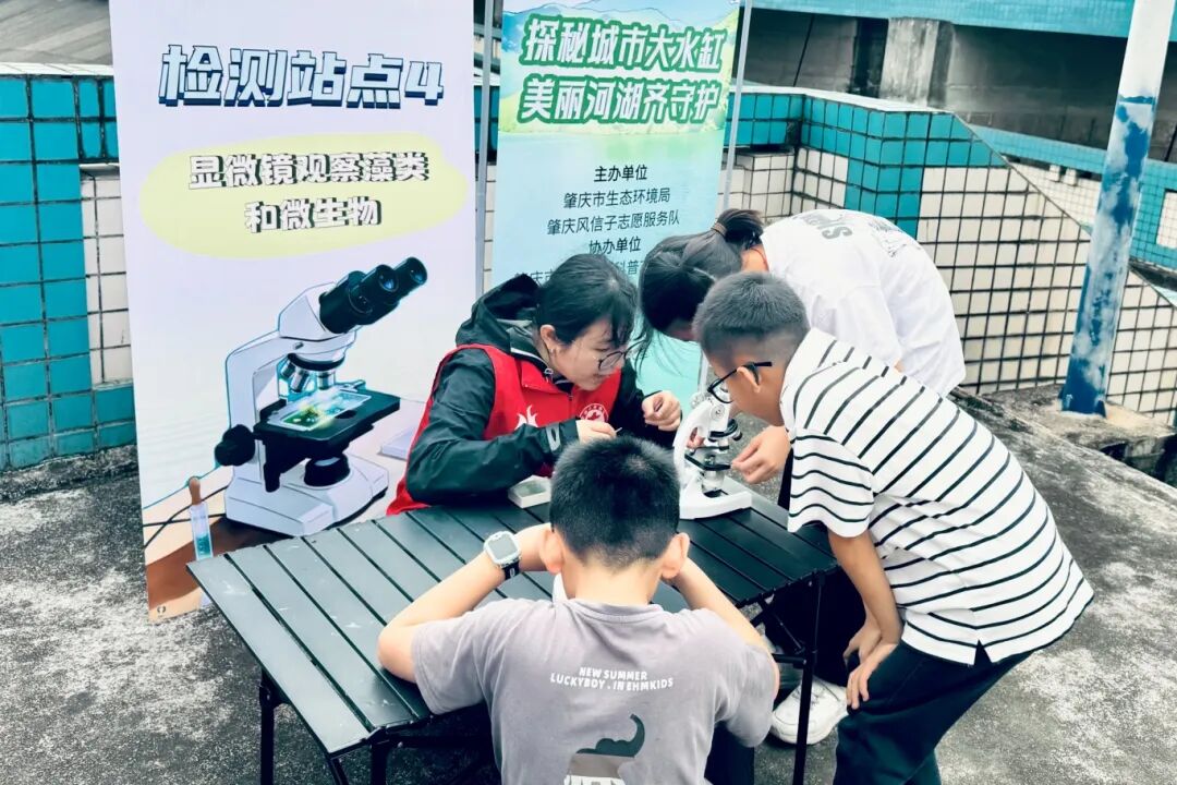 活动最有趣的环节是“四大健康检测”。现场设置了水生生物完整性指数、水体透明度与气味、氮磷快速检测、显微镜观察藻类和微生物四个特色站点。孩子们在志愿者指导下亲自动手,测水质、闻气味、看显微镜,在实践中学到了水生生物完整性、富营养化、水华等专业概念,真正过了一把“水库医生”的瘾。