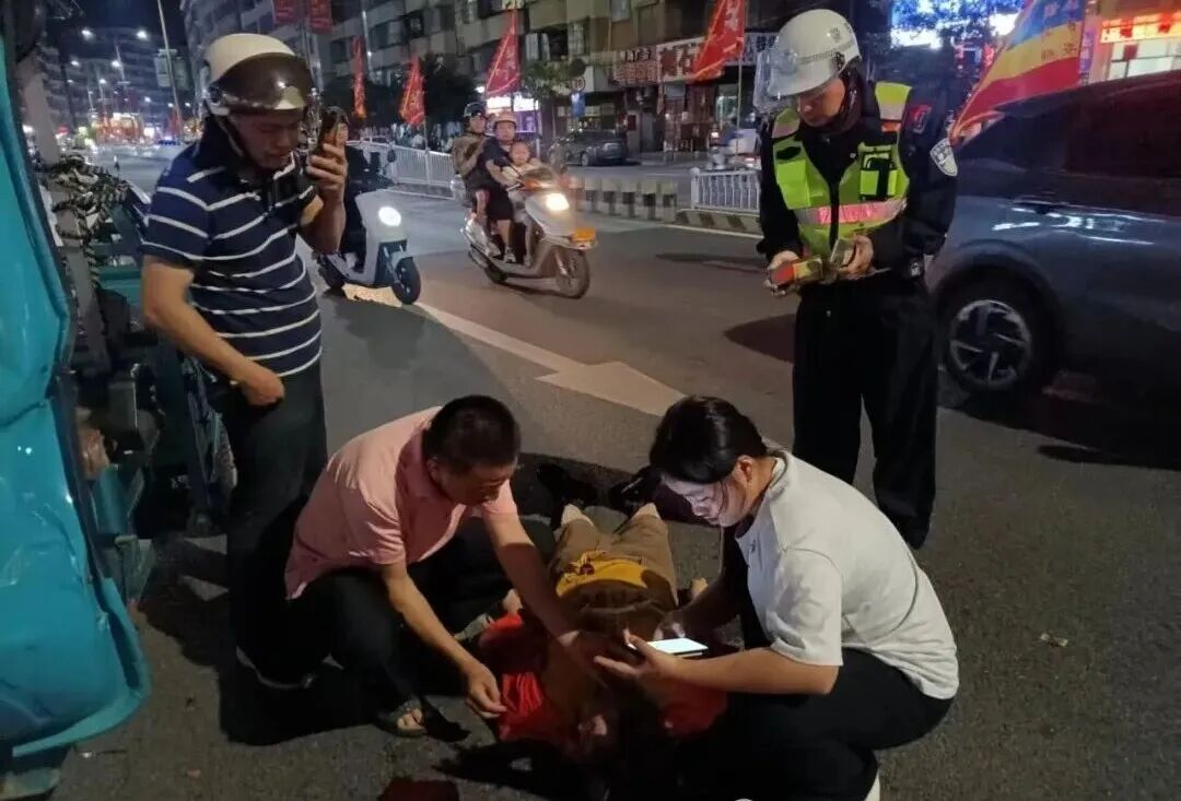 夜晚的街头,车来车往。他们一左一右守在伤者身边,一边防止二次事故,一边等待120。