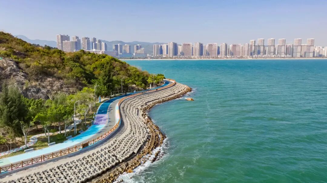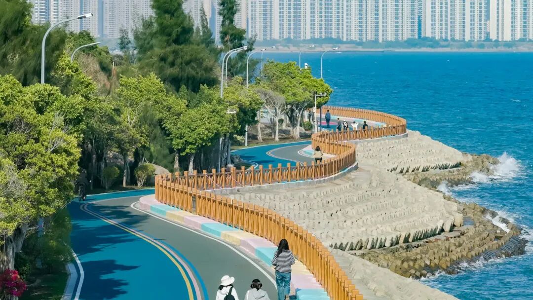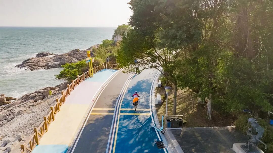 这里的坡度起伏有致,既不会让人累得气喘吁吁,又能体验到骑行特有的节奏感。绿道新铺设了沥青路面,骑着车在新铺的沥青路面上,海风吹拂着,忽然一个转弯,明媚的阳光之下,一大片海就出现在你的眼前,蓝绿之间,变幻着迷人的颜色。