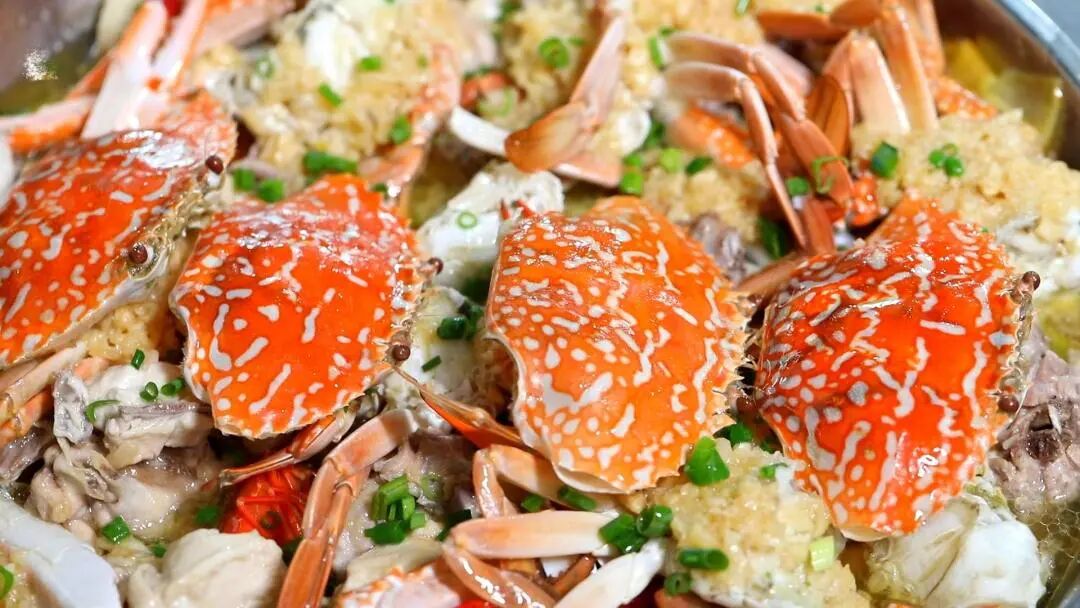 螃蟹、虾、鸡肉的组合,用海鲜必备蒜蓉酱腌制后上锅清蒸,鸡肉吸满海鲜的鲜甜,蒜香四溢。新鲜花蟹、海虾肉质饱满,每一口都能带来极大满足。
