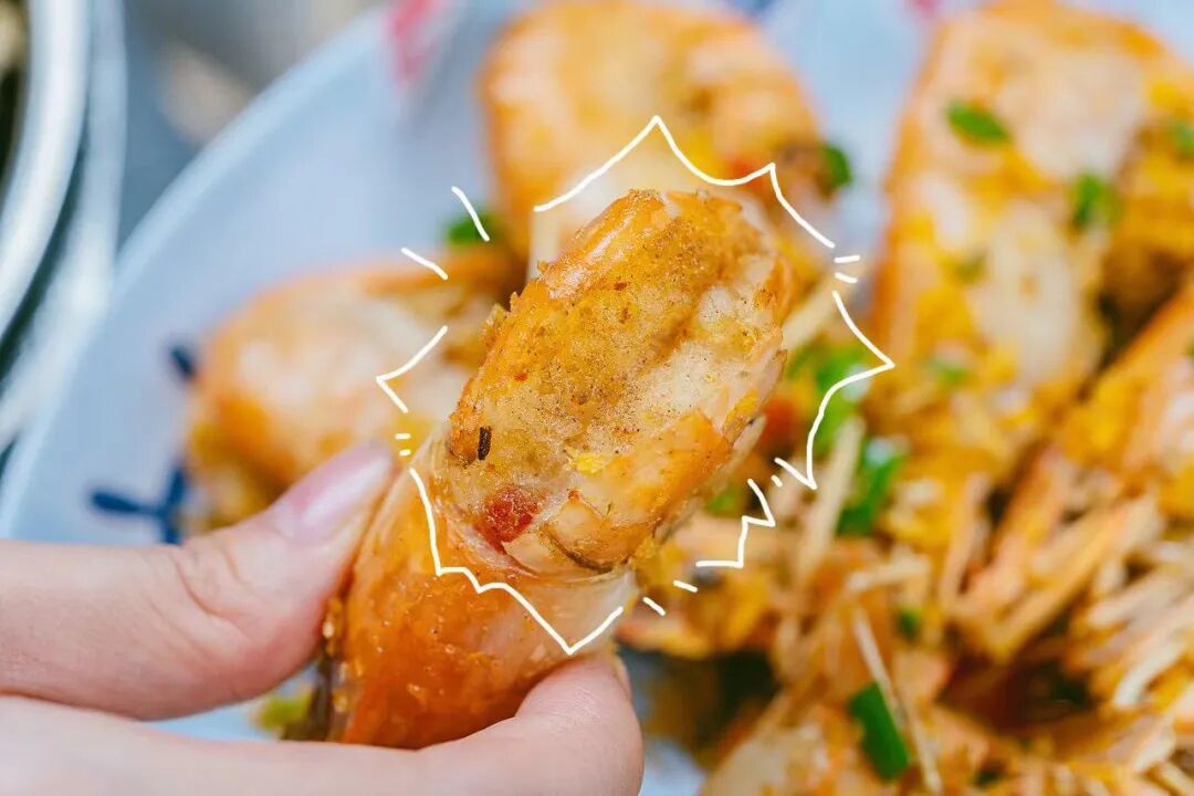 满满的咸蛋黄包裹着整只虾,连虾壳都炸得金黄酥脆,咸蛋黄的天然油脂与脆虾互相融合,一口咬下去,就能感受到外脆里嫩的大虾和咸蛋黄的浓郁香气。