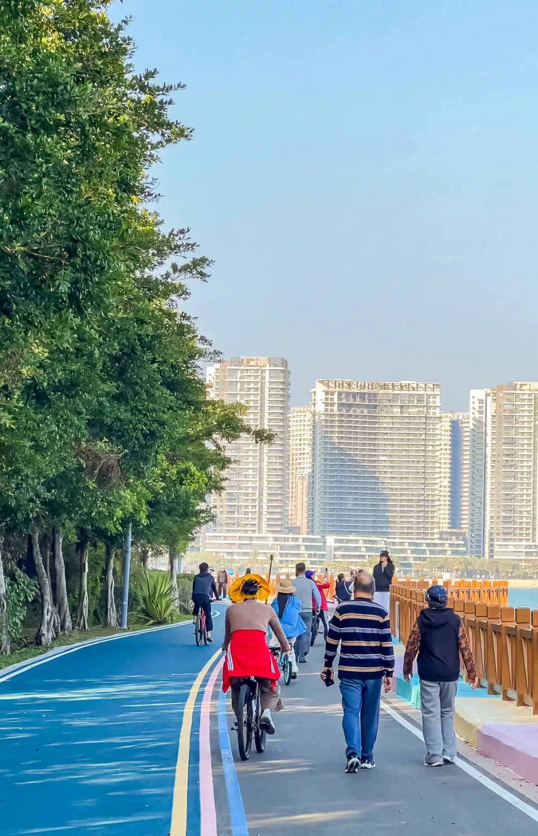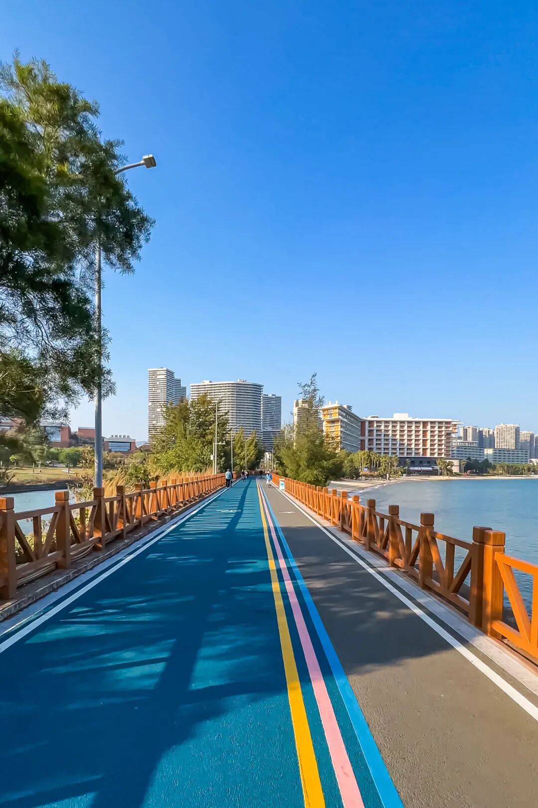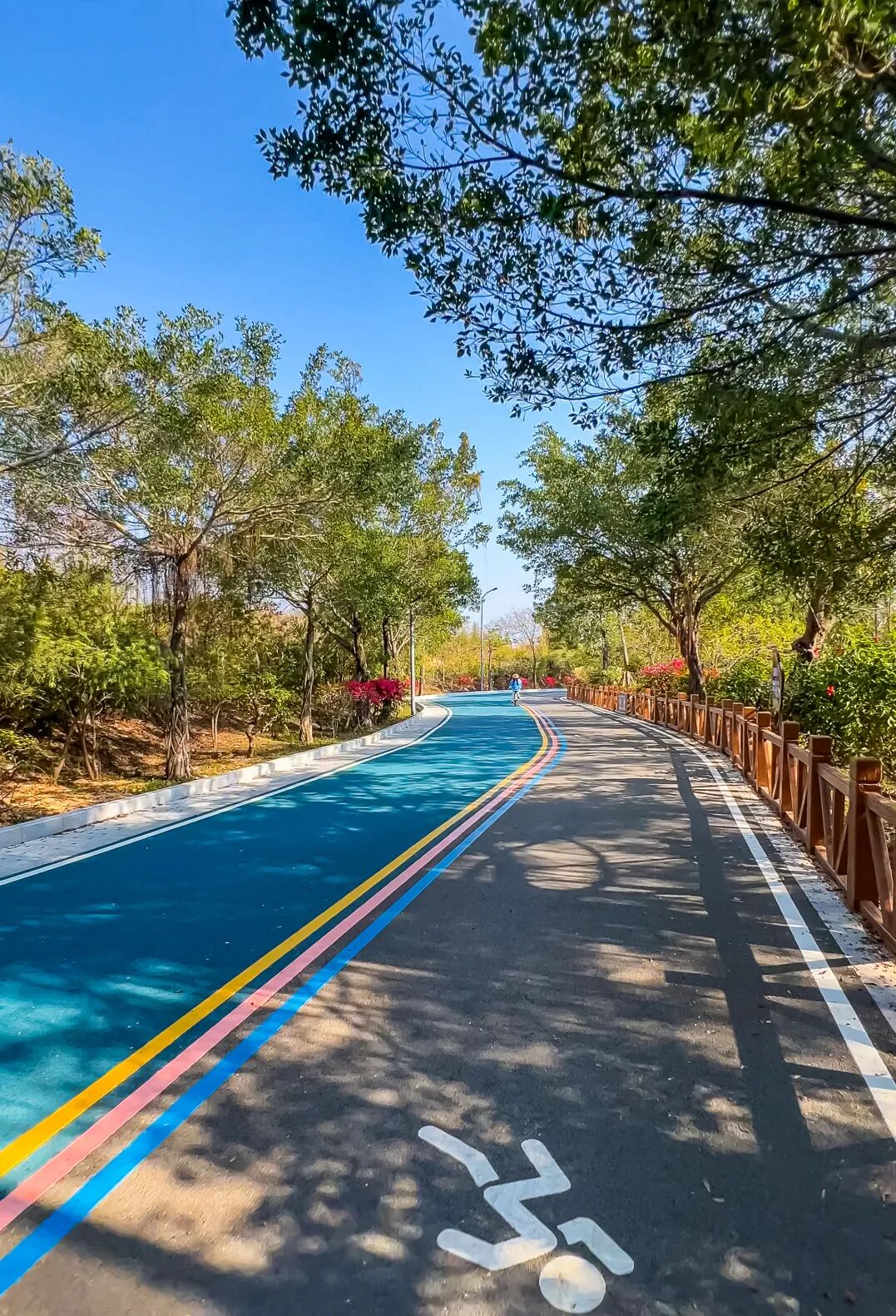 如果说黄金海岸是热烈的序曲,那么乌山头绿道就是一首清新的田园诗。这条绿道依山而建,巧妙地避开了机动车的干扰,设置了骑行绿道和人行道,骑行道与散步道用不同颜色清晰区分,指引明确,老人小孩漫步、骑行都很安心。