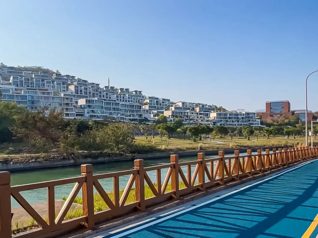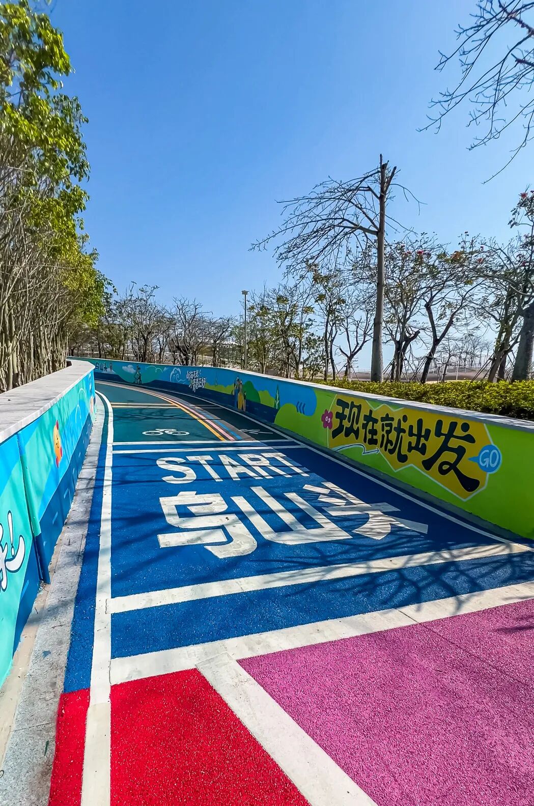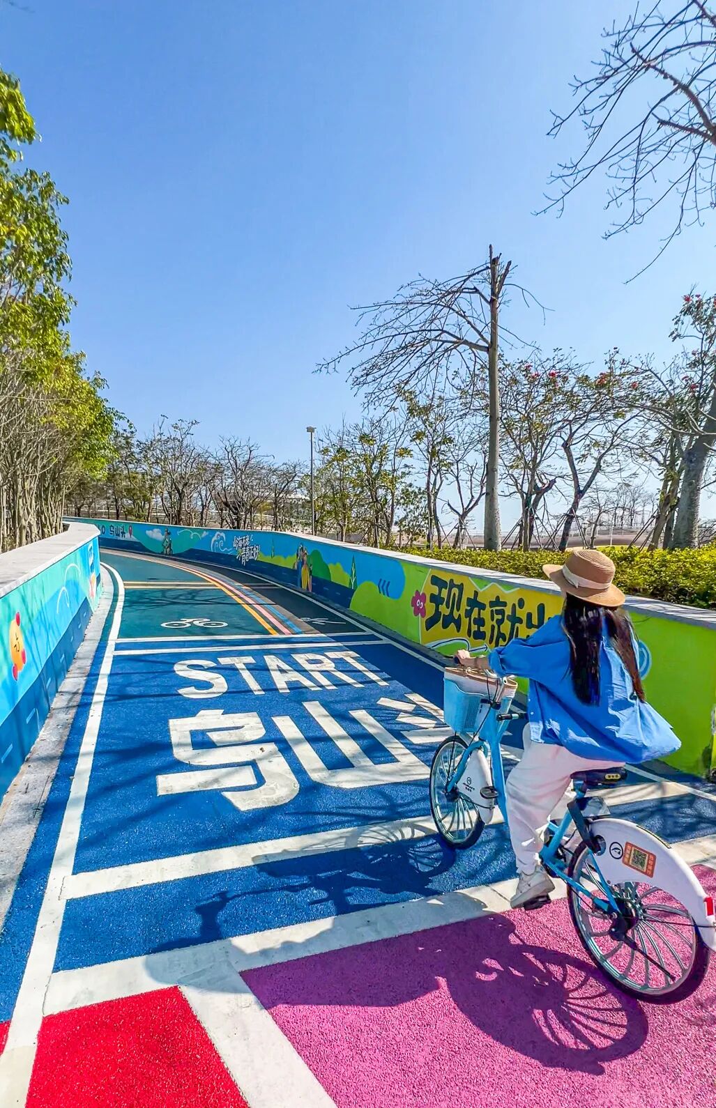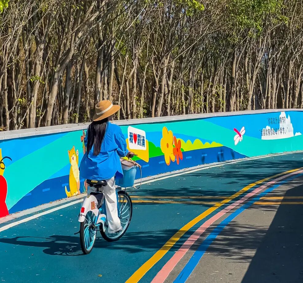 如果说黄金海岸是热烈的序曲,那么乌山头绿道就是一首清新的田园诗。这条绿道依山而建,巧妙地避开了机动车的干扰,设置了骑行绿道和人行道,骑行道与散步道用不同颜色清晰区分,指引明确,老人小孩漫步、骑行都很安心。