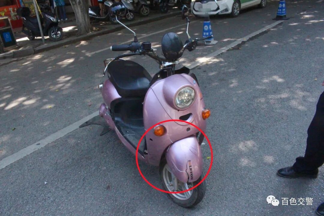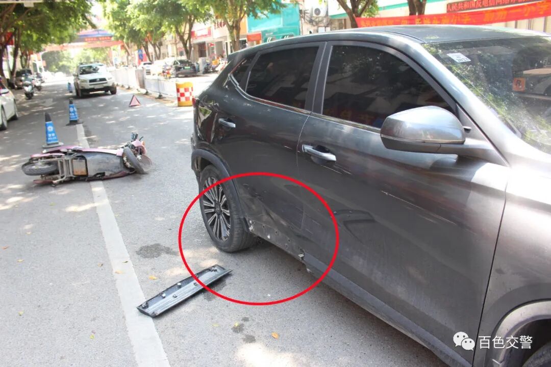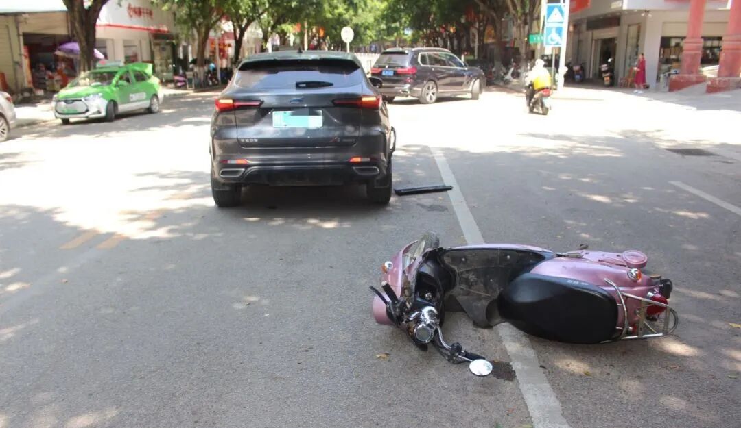 民警到达现场后发现,小车停在路中间,右侧挡泥板掉落在地,电动车倒在小车后方,车头裂开。