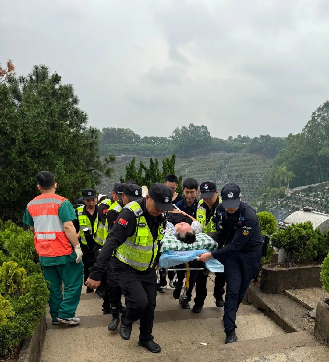 4月6日上午10时30分左右,华夏陵园值班安保在山上日常巡逻时听到呼喊,现场有一名老人突发昏迷晕厥,情况十分紧急,他立即通过对讲机报告从化区清明工作现场指挥部。