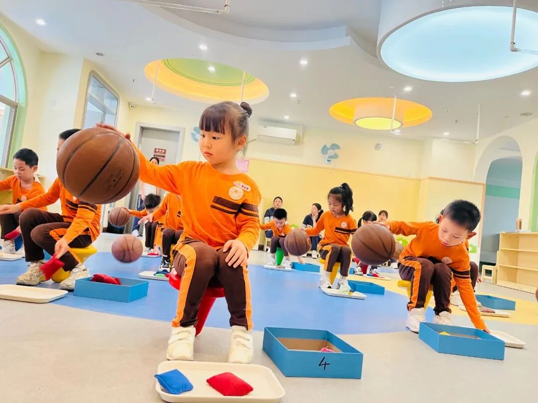 孩子们会稳稳坐在独角凳上,一手控球保持节奏,另一手自如转动呼啦圈;也会在用手拍球的同时,快速追踪闪现的数字并准确点数。