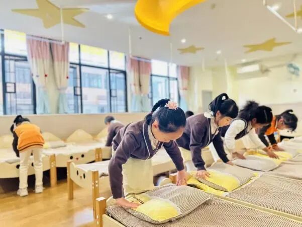 在黄广牛剑幼儿园,收拾书包、擦桌子、叠被子这些看似平凡的自理项目,是孩子们从三岁起便开始的“必修课”。