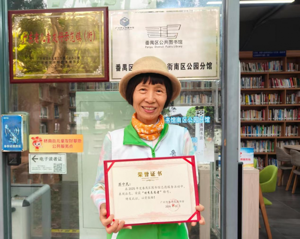 春日的南区公园绿意盎然,西北角那座通透的玻璃书房里,总能看到苏中民女士忙碌的身影。作为番禺区图书馆桥南街南区公园分馆(“禺阅书房”)的常驻志愿者,她在方寸书香间传递温暖,在2025年度番禺区图书分馆志愿服务活动中荣获“优秀志愿者”称号,用行动彰显了桥南街社区文化志愿服务的良好风貌。