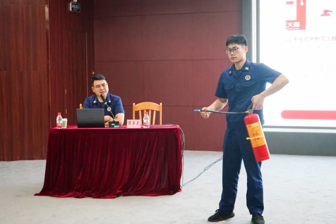 在消防安全培训环节,东莞市消防救援支队高级讲师谭平民结合近期典型火灾事故案例,深入剖析事故成因与教训,详细讲解了消防法律法规、消防安全重大隐患判定标准、人员密集场所消防安全隐患排查方法、初期火灾扑救技巧、消防设施正确使用方法以及应急疏散逃生要点等内容。现场还进行了灭火实操体验。