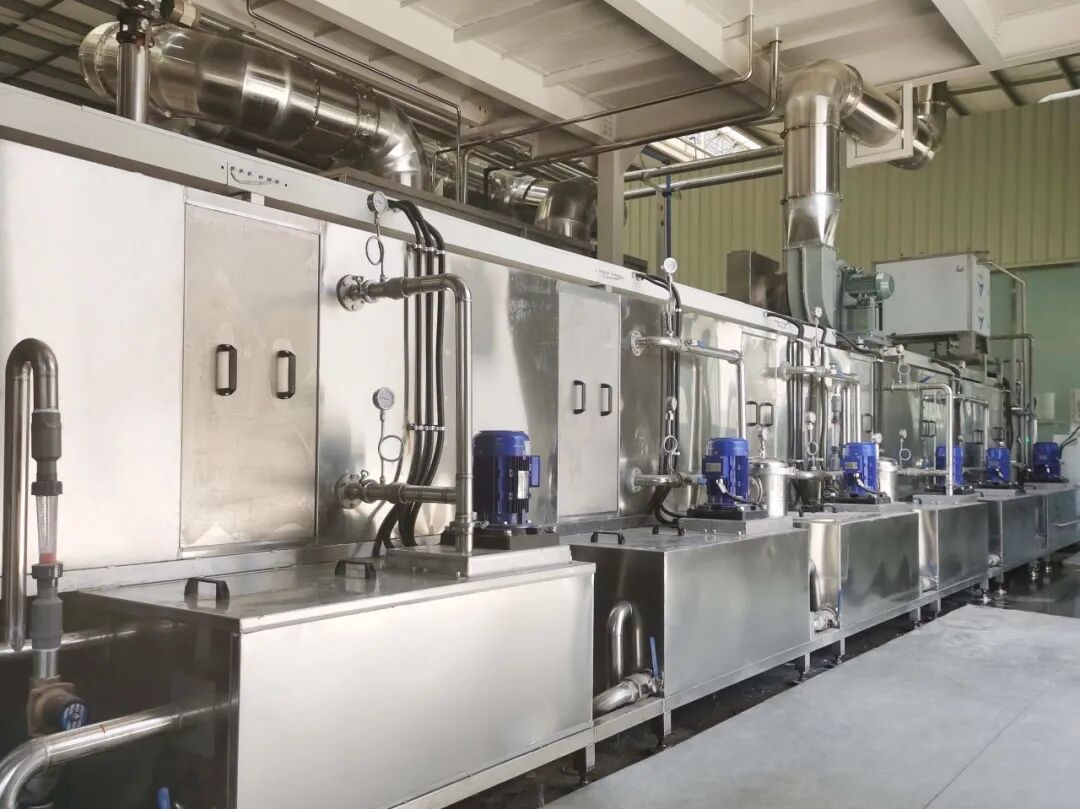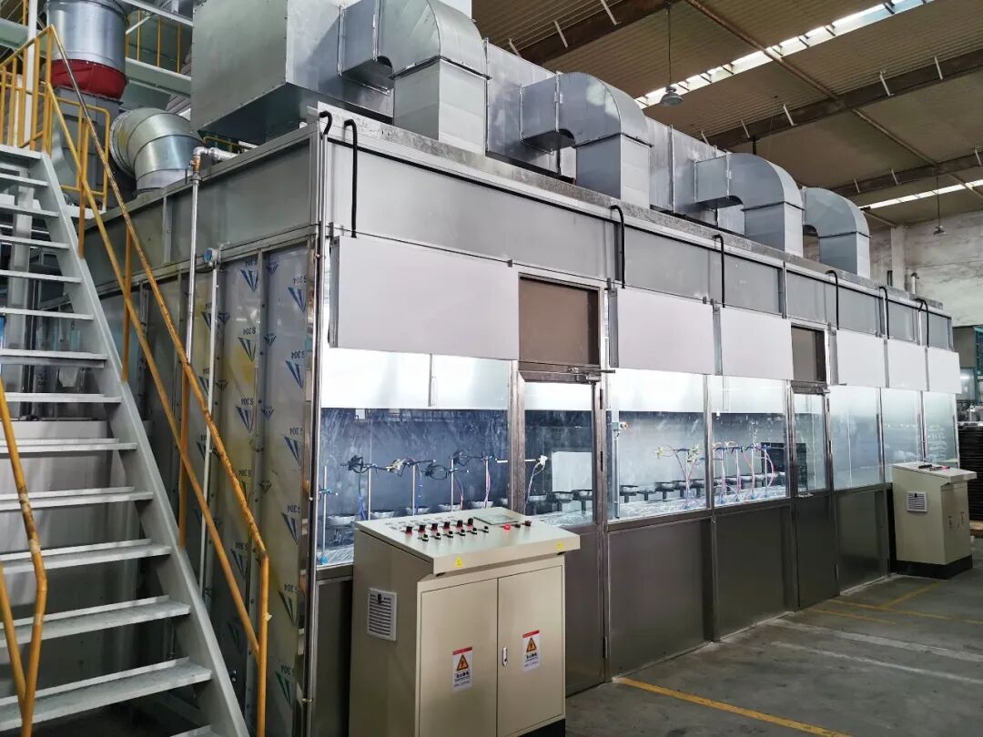 不仅如此,设备还采用企业自主研发的快速吹扫吹风嘴结构,能够有效处理气体中的颗粒物,处理率可达到90%-95%,从而提高生产线对产品进行喷涂时的涂层厚度均匀性和结合强度;同时采用自主专利产品前处理废气冷凝免排系统,作用于前处理废气收集,回收废气经过冷凝器及过滤后送回至前处理两端,形成循环,从而达到免排的效果。